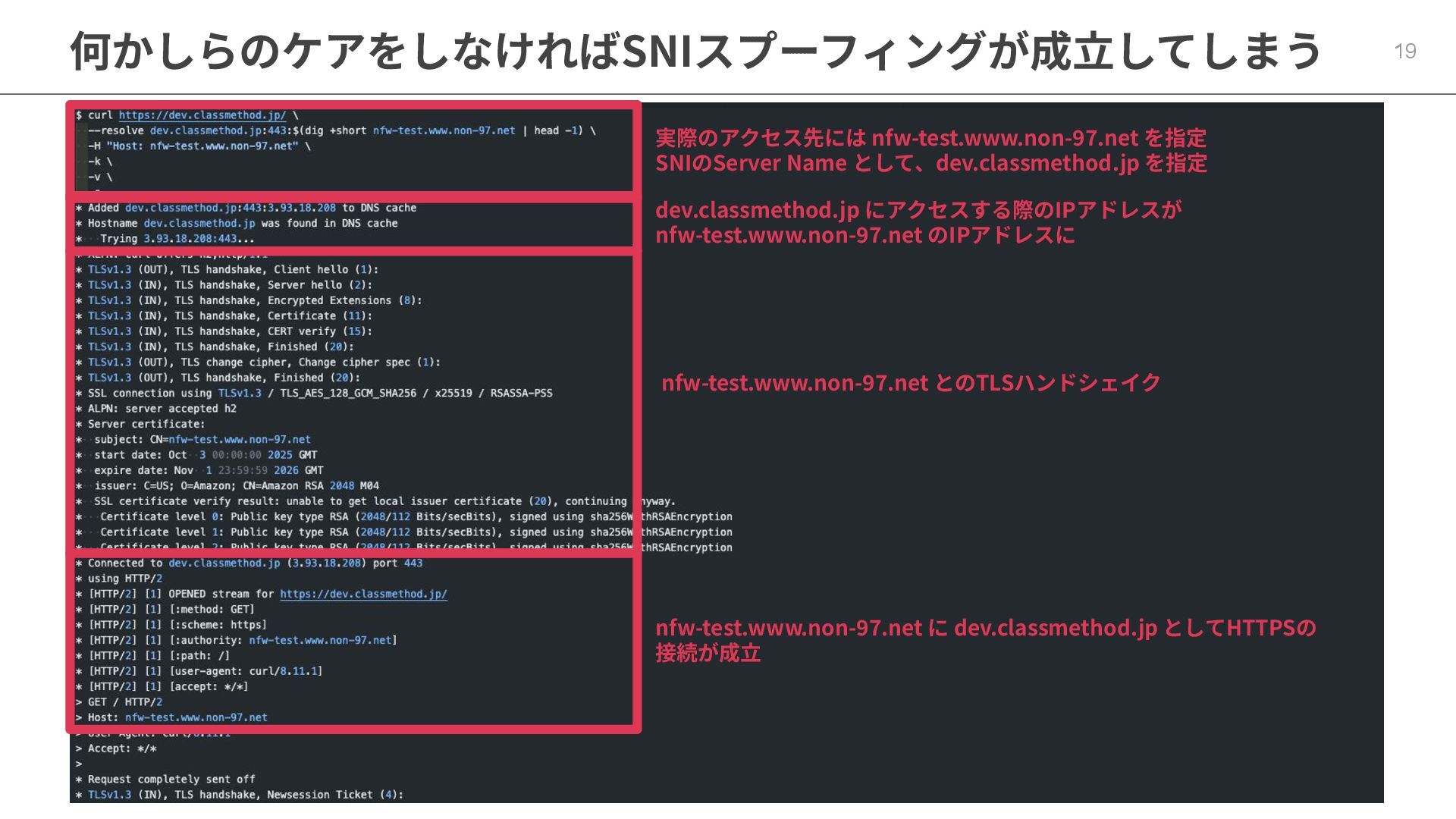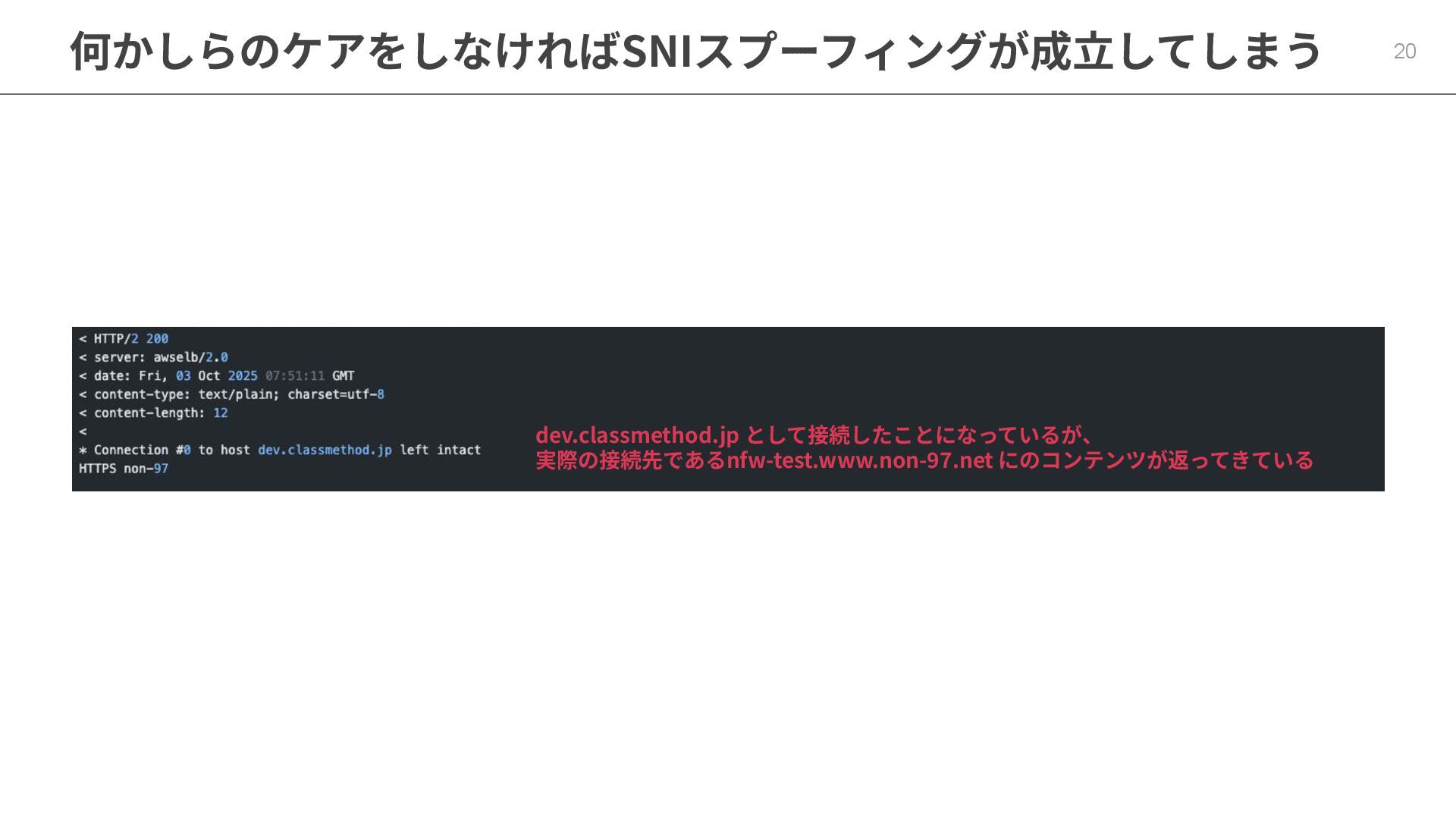 何かしらのケアをしなければSNIスプーフィングが成⽴してしまう 19 実際のアクセス先には nfw-test.www.non-97.net を指定 SNIのServer Name として、dev.classmethod.jp を指定 dev.classmethod.jp