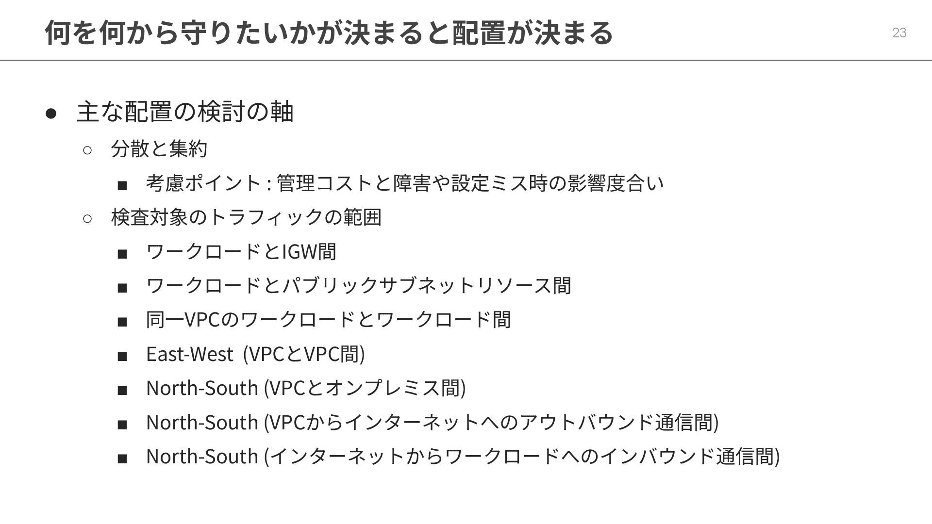 何を何から守りたいかが決まると配置が決まる 23 • 主な配置の検討の軸 ◦ 分散と集約 ▪ 考慮ポイント : 管理コストと障害や設定ミス時の影響度合い