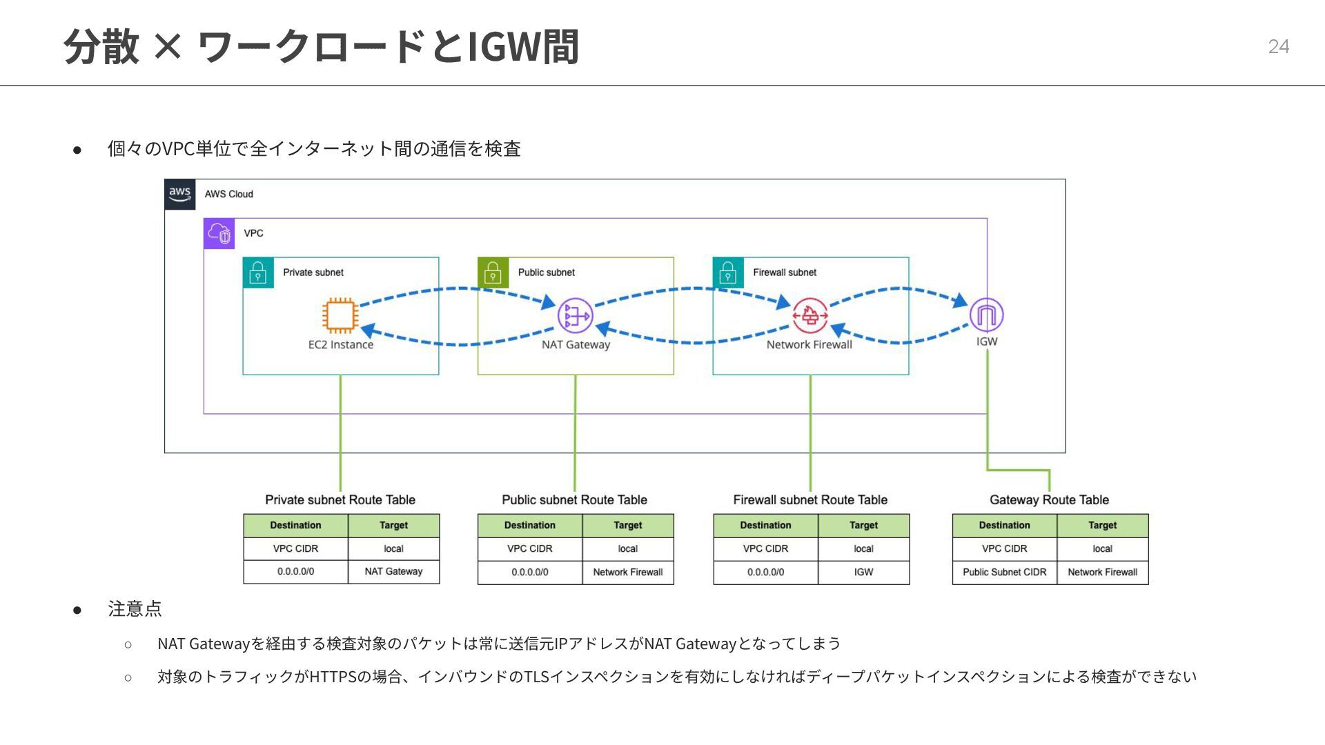 分散 × ワークロードとIGW間 24 • 個々のVPC単位で全インターネット間の通信を検査 • 注意点 ◦ NAT
