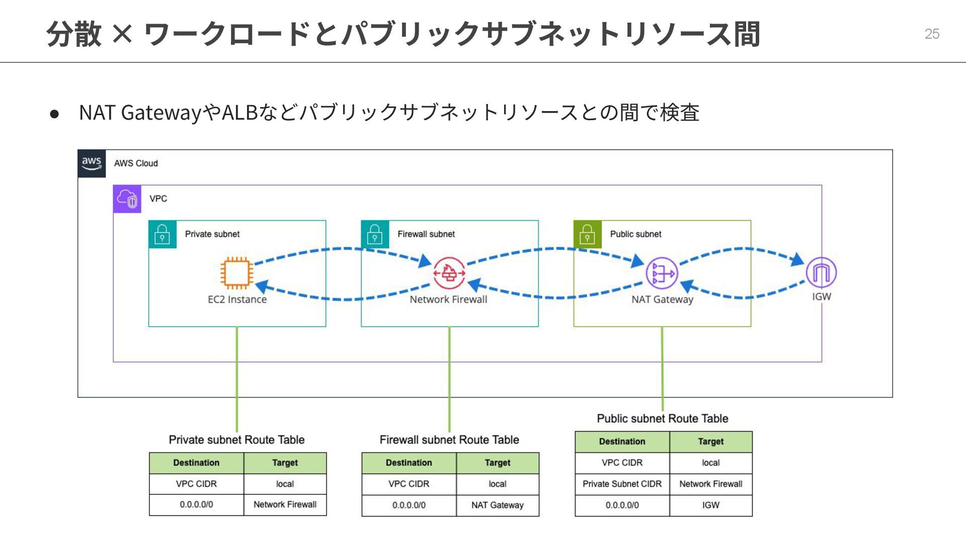 分散 × ワークロードとパブリックサブネットリソース間 25 • NAT GatewayやALBなどパブリックサブネットリソースとの間で検査