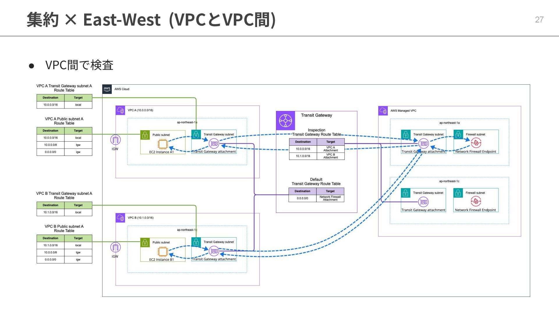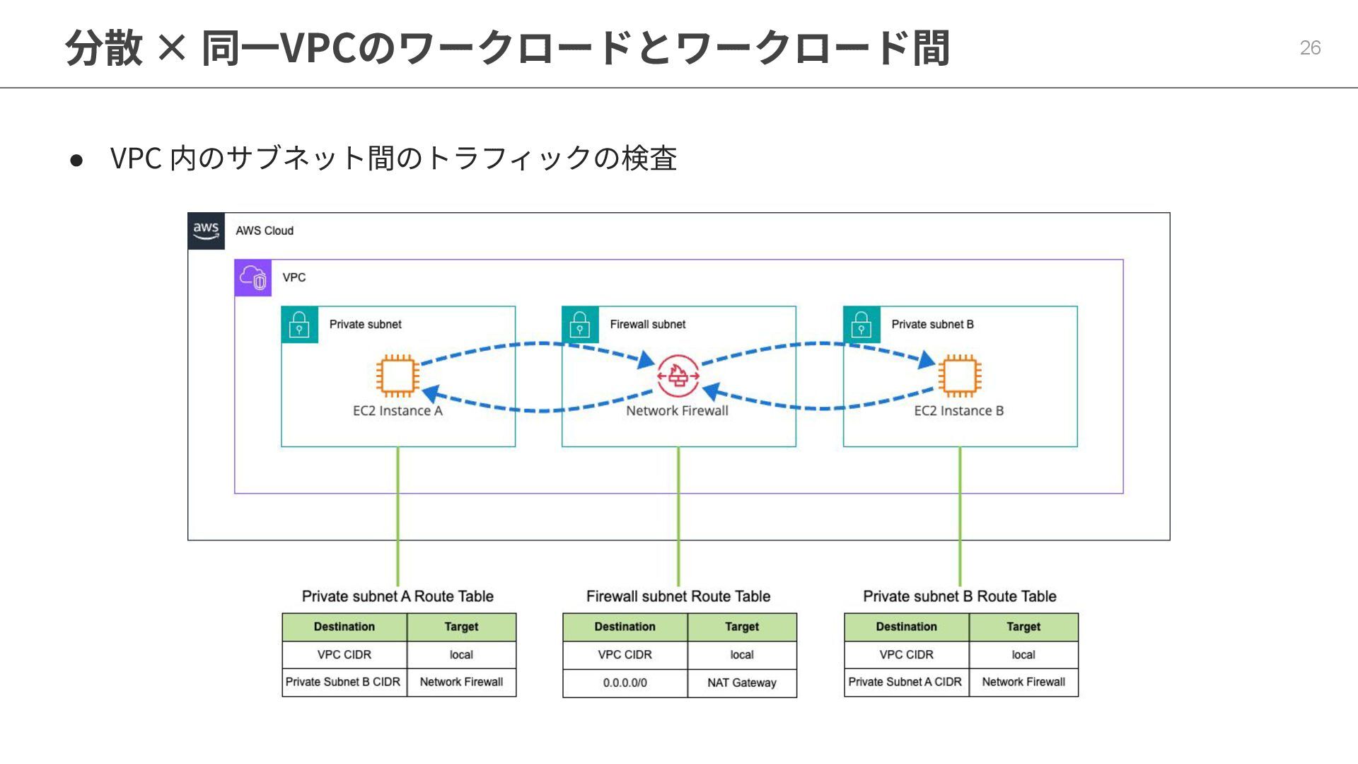 分散 × 同⼀VPCのワークロードとワークロード間 26 • VPC 内のサブネット間のトラフィックの検査