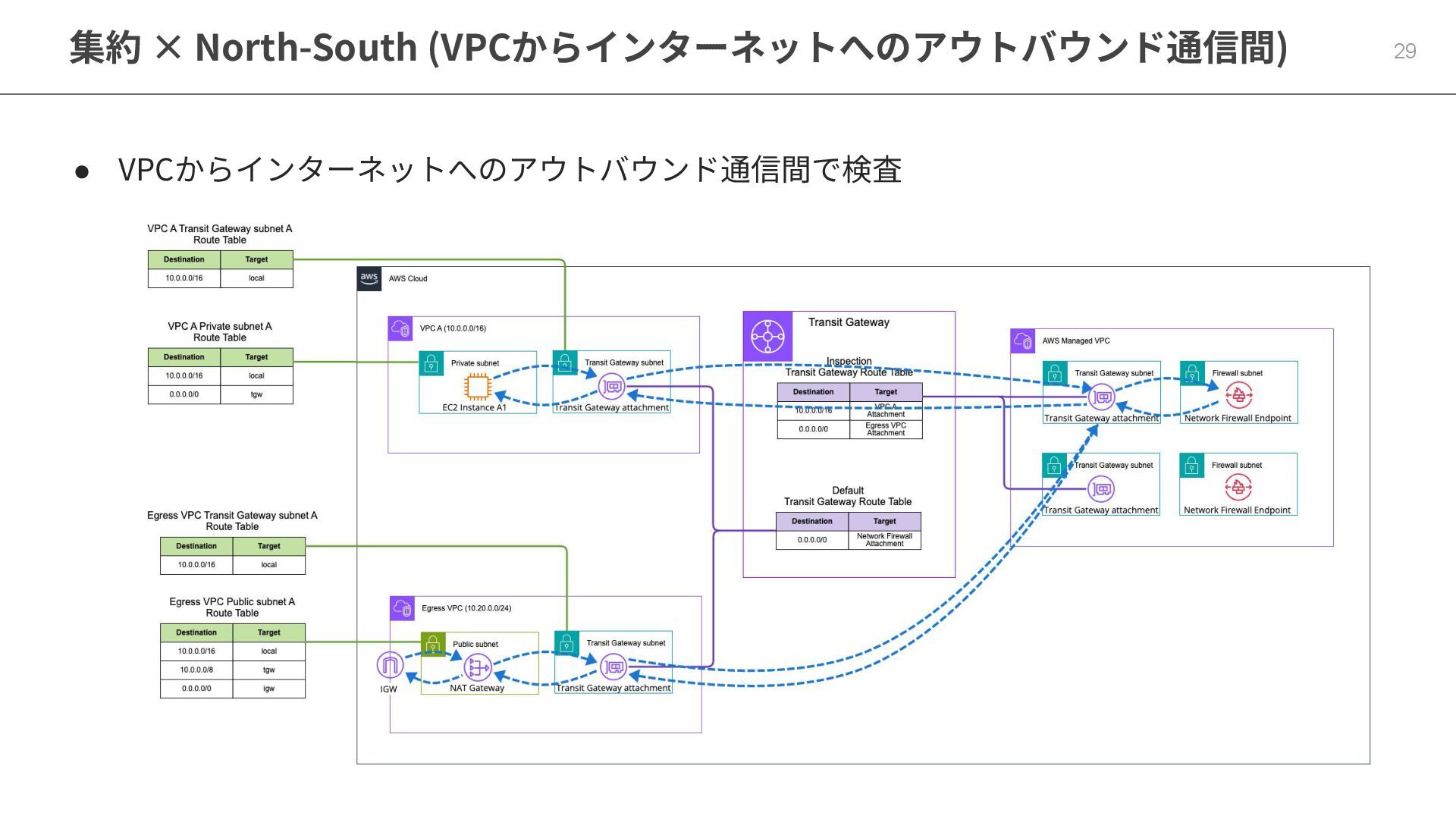 集約 × North-South (VPCからインターネットへのアウトバウンド通信間) 29 • VPCからインターネットへのアウトバウンド通信間で検査