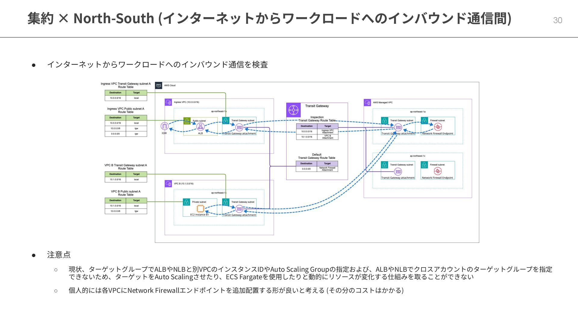 集約 × North-South (インターネットからワークロードへのインバウンド通信間) 30 • インターネットからワークロードへのインバウンド通信を検査 • 注意点 ◦
