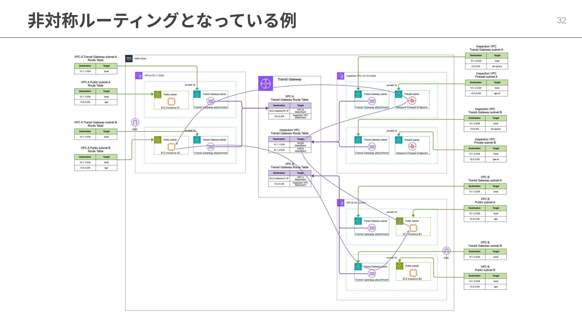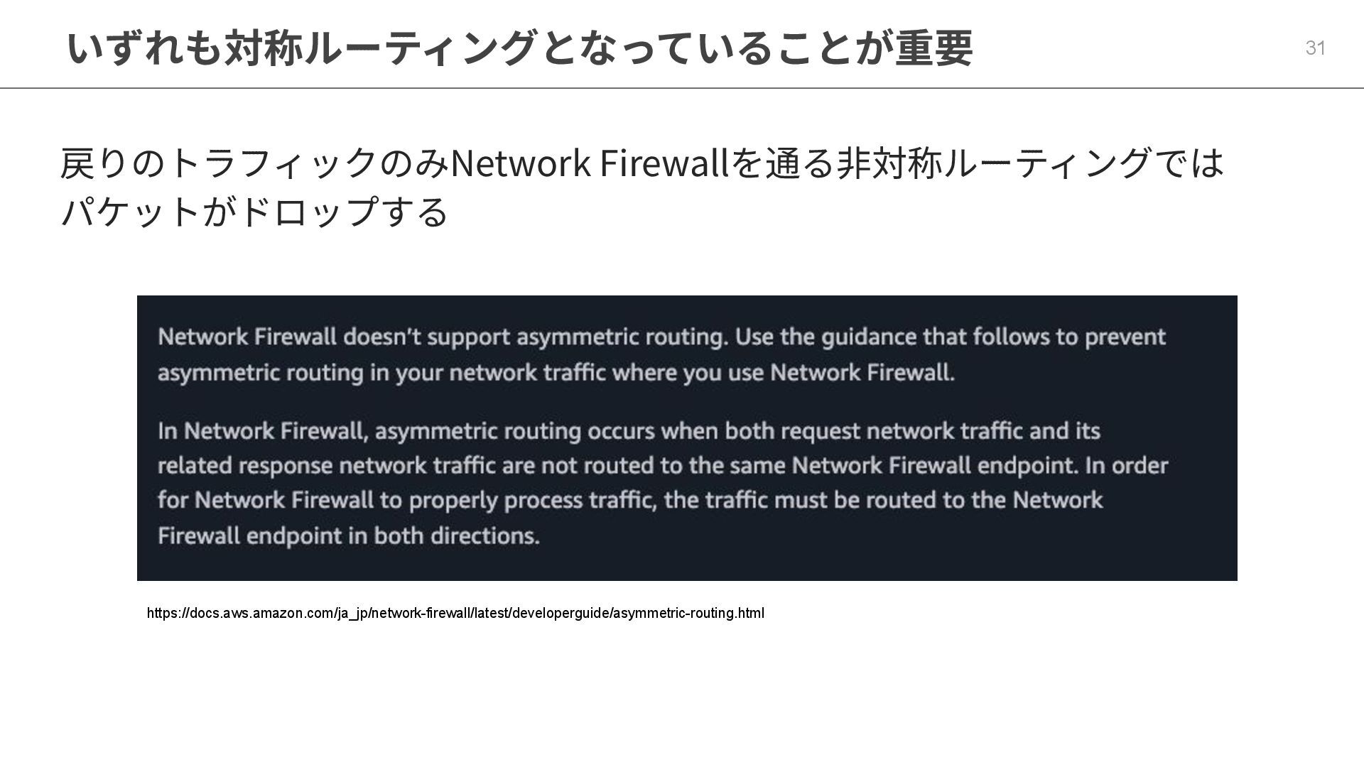 いずれも対称ルーティングとなっていることが重要 31 戻りのトラフィックのみNetwork Firewallを通る⾮対称ルーティングでは パケットがドロップする https://docs.aws.amazon.com/ja_jp/network-firewall/latest/developerguide/asymmetric-routing.html