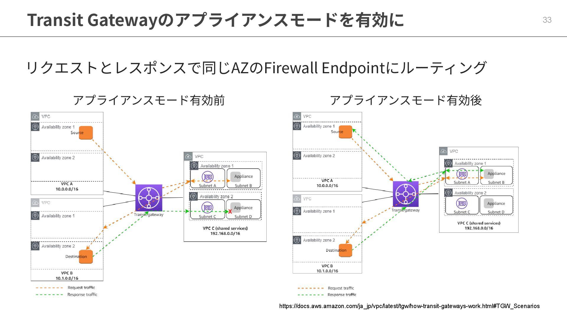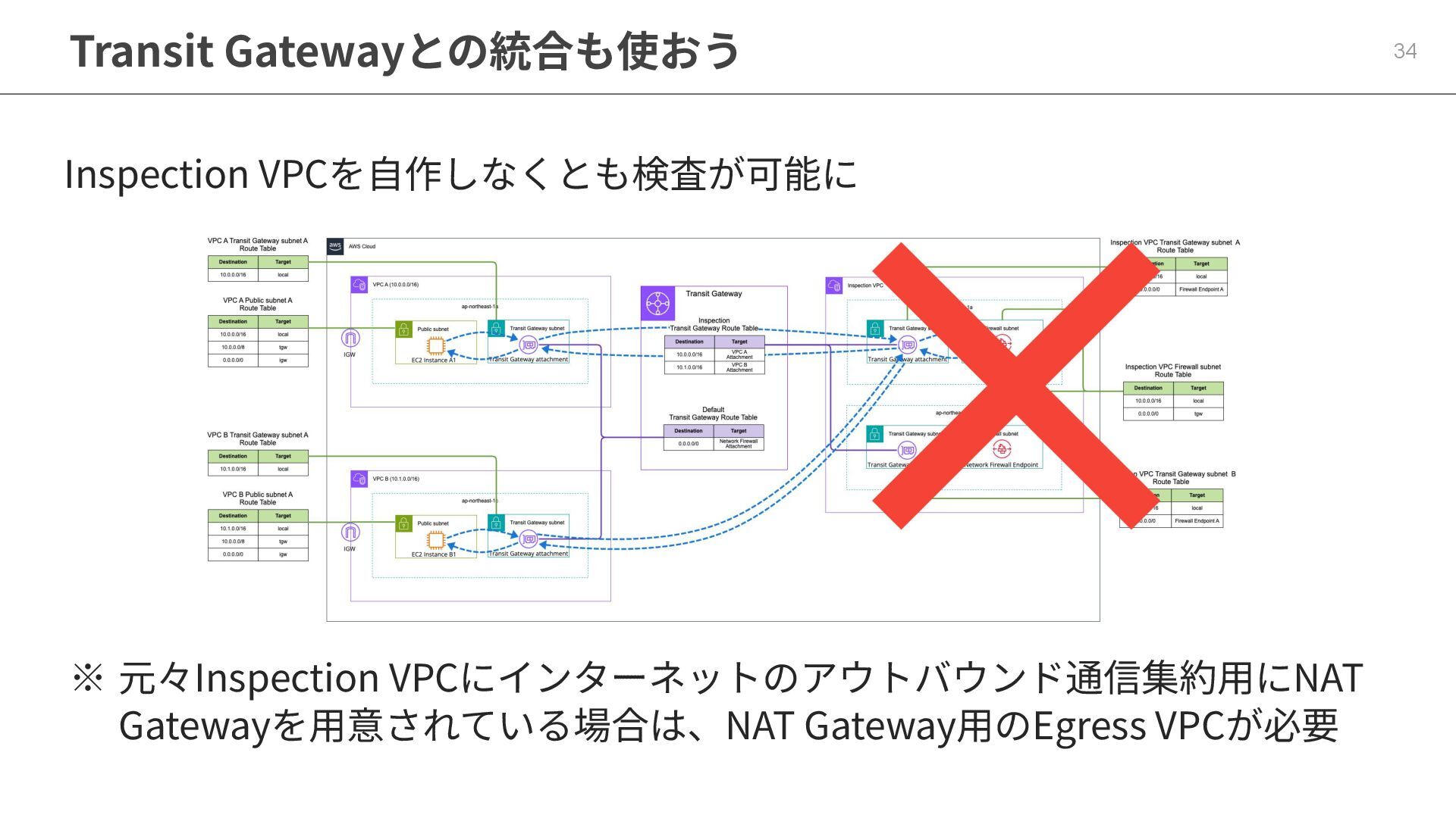 Transit Gatewayのアプライアンスモードを有効に 33 リクエストとレスポンスで同じAZのFirewall Endpointにルーティング https://docs.aws.amazon.com/ja_jp/vpc/latest/tgw/how-transit-gateways-work.html#TGW_Scenarios アプライアンスモード有効前 アプライアンスモード有効後