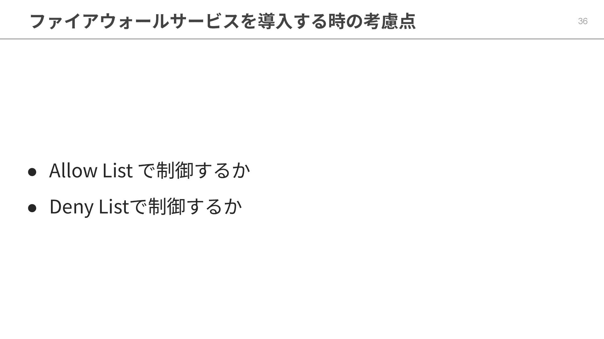 ファイアウォールサービスを導⼊する時の考慮点 36 • Allow List で制御するか • Deny Listで制御するか