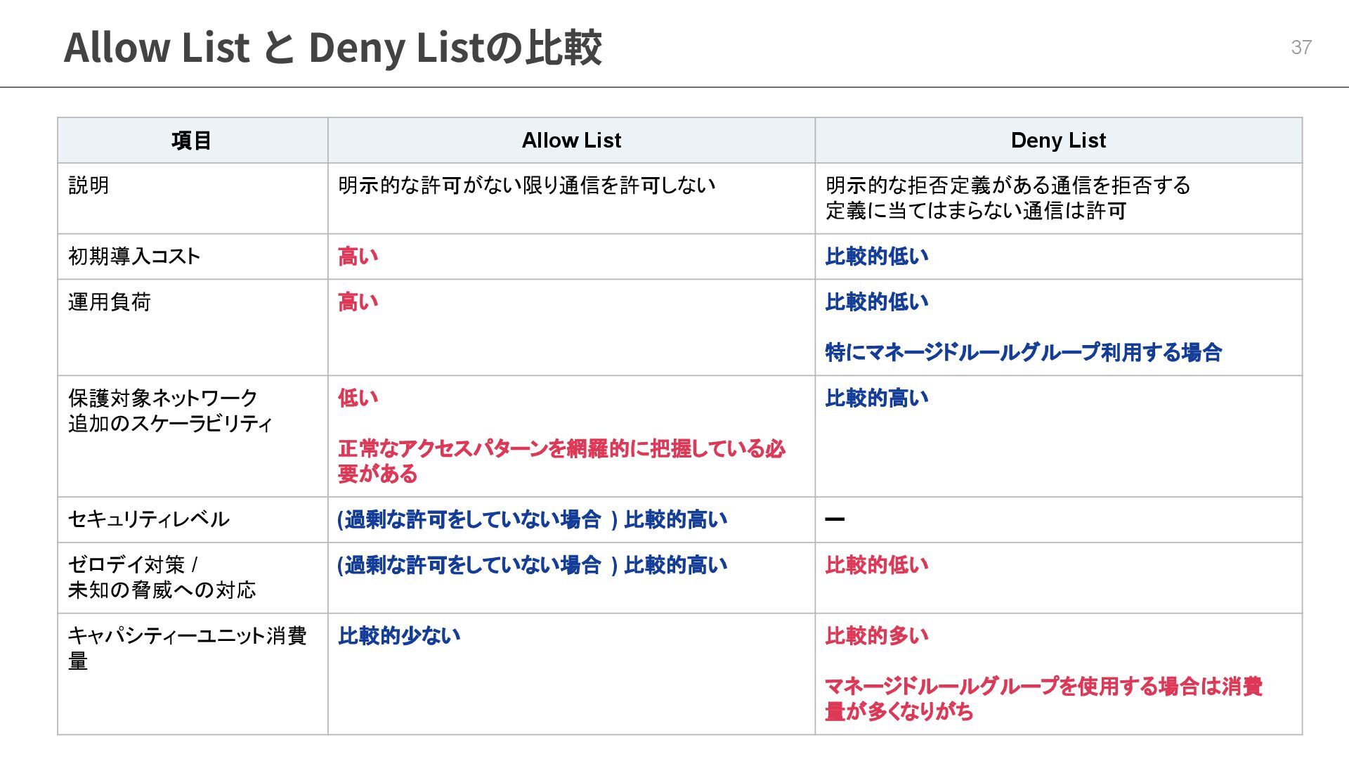 Allow List と Deny Listの⽐較 37 項目 Allow List Deny