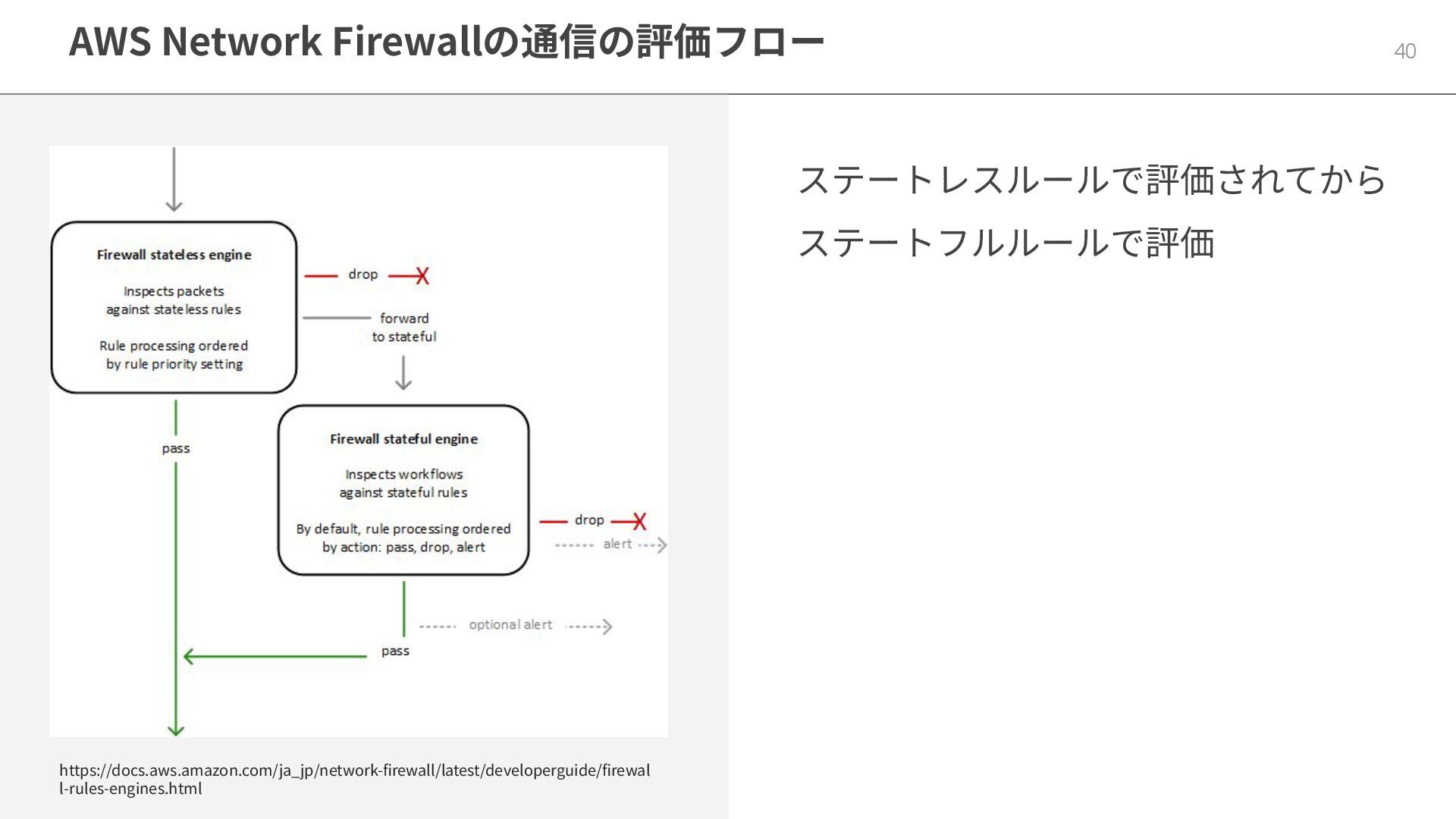 AWS Network Firewallの通信の評価フロー 40 ステートレスルールで評価されてから ステートフルルールで評価 https://docs.aws.amazon.com/ja_jp/network-firewall/latest/developerguide/firewal l-rules-engines.html