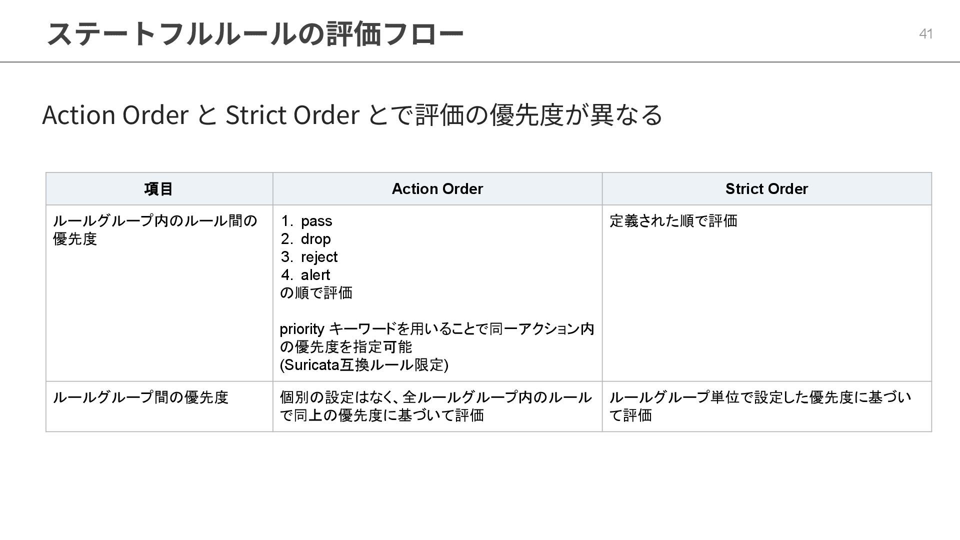 Order Strict Order ルールグループ内のルール間の 優先度 1. pass 2. drop 3. reject 4. alert の順で評価 priority キーワードを用いることで同一アクション内 の優先度を指定可能 (Suricata互換ルール限定) 定義された順で評価 ルールグループ間の優先度 個別の設定はなく、全ルールグループ内のルール で同上の優先度に基づいて評価 ルールグループ単位で設定した優先度に基づい て評価