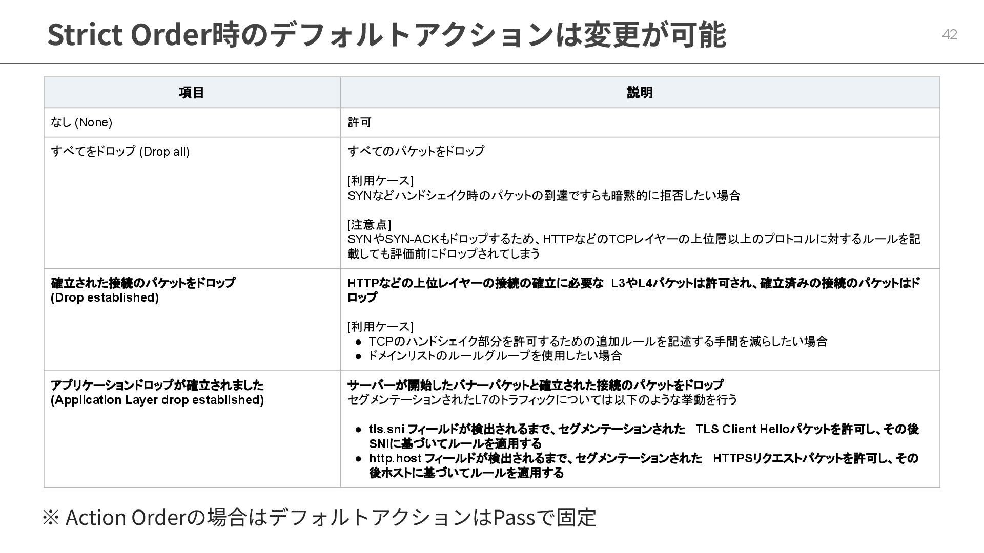 ステートフルルールの評価フロー 41 Action Order と Strict Order とで評価の優先度が異なる 項目 Action