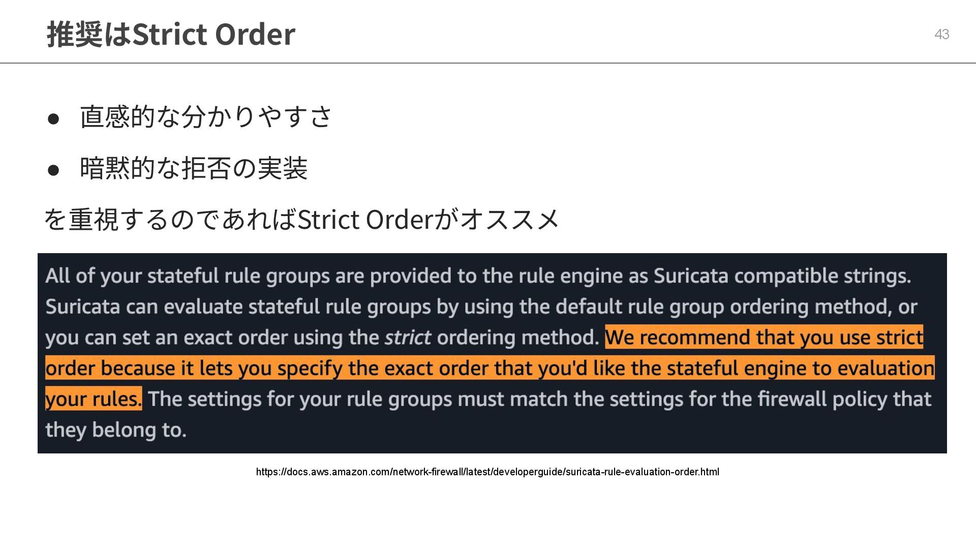 推奨はStrict Order 43 https://docs.aws.amazon.com/network-firewall/latest/developerguide/suricata-rule-evaluation-order.html • 直感的な分かりやすさ • 暗黙的な拒否の実装 を重視するのであればStrict Orderがオススメ