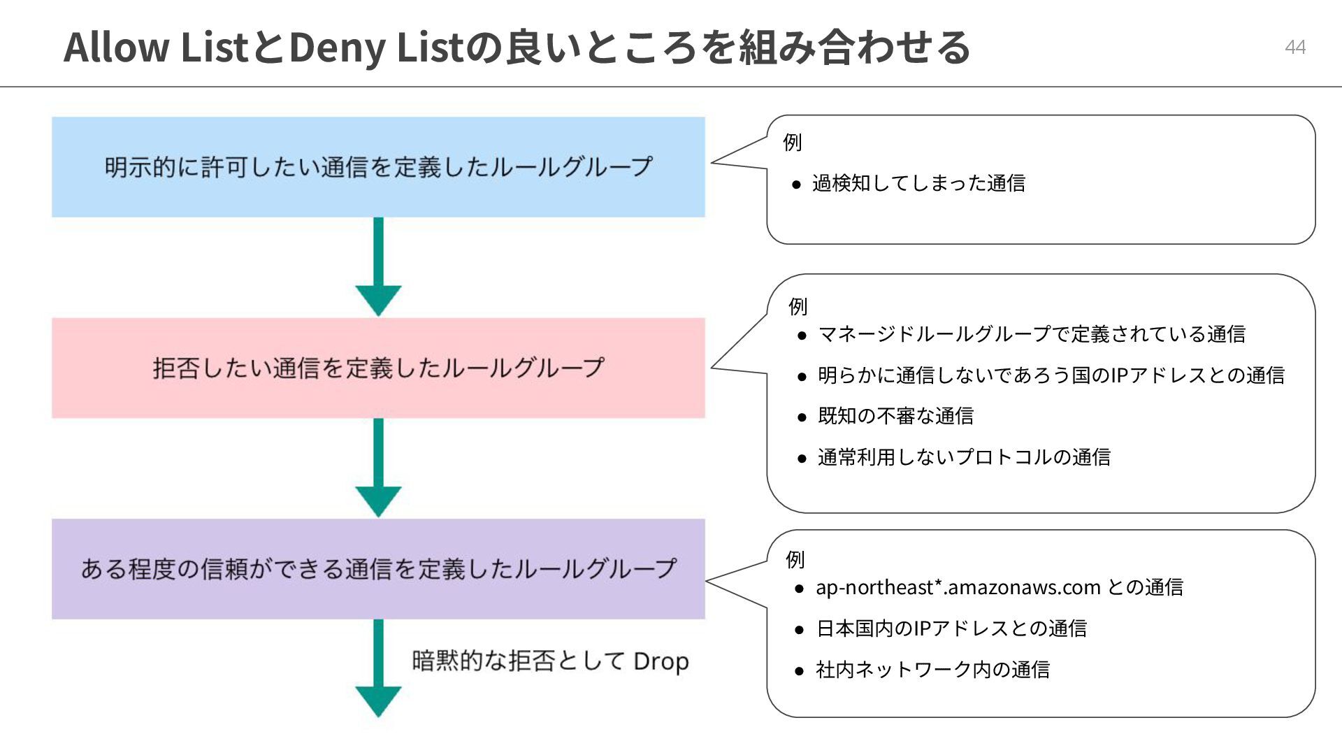 Allow ListとDeny Listの良いところを組み合わせる 44 例 • 過検知してしまった通信 例 • マネージドルールグループで定義されている通信