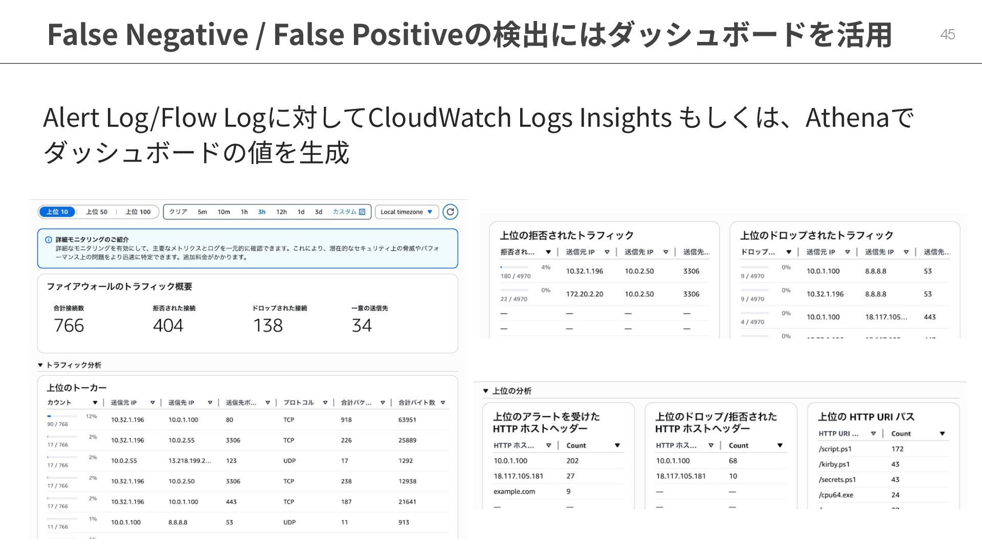 False Negative / False Positiveの検出にはダッシュボードを活⽤ 45 Alert Log/Flow Logに対してCloudWatch Logs