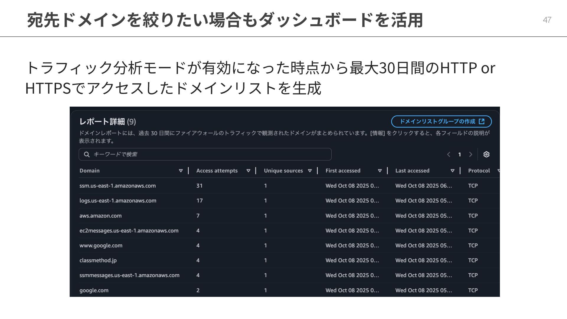 宛先ドメインを絞りたい場合もダッシュボードを活⽤ 47 トラフィック分析モードが有効になった時点から最⼤30⽇間のHTTP or HTTPSでアクセスしたドメインリストを⽣成