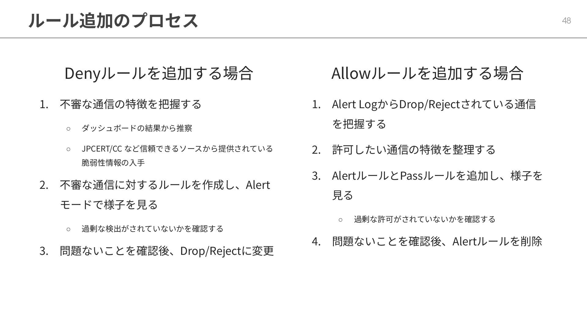 脆弱性情報の⼊⼿ 2. 不審な通信に対するルールを作成し、Alert モードで様⼦を⾒る ◦ 過剰な検出がされていないかを確認する 3. 問題ないことを確認後、Drop/Rejectに変更 Allowルールを追加する場合 1. Alert LogからDrop/Rejectされている通信 を把握する 2. 許可したい通信の特徴を整理する 3. AlertルールとPassルールを追加し、様⼦を ⾒る ◦ 過剰な許可がされていないかを確認する 4. 問題ないことを確認後、Alertルールを削除