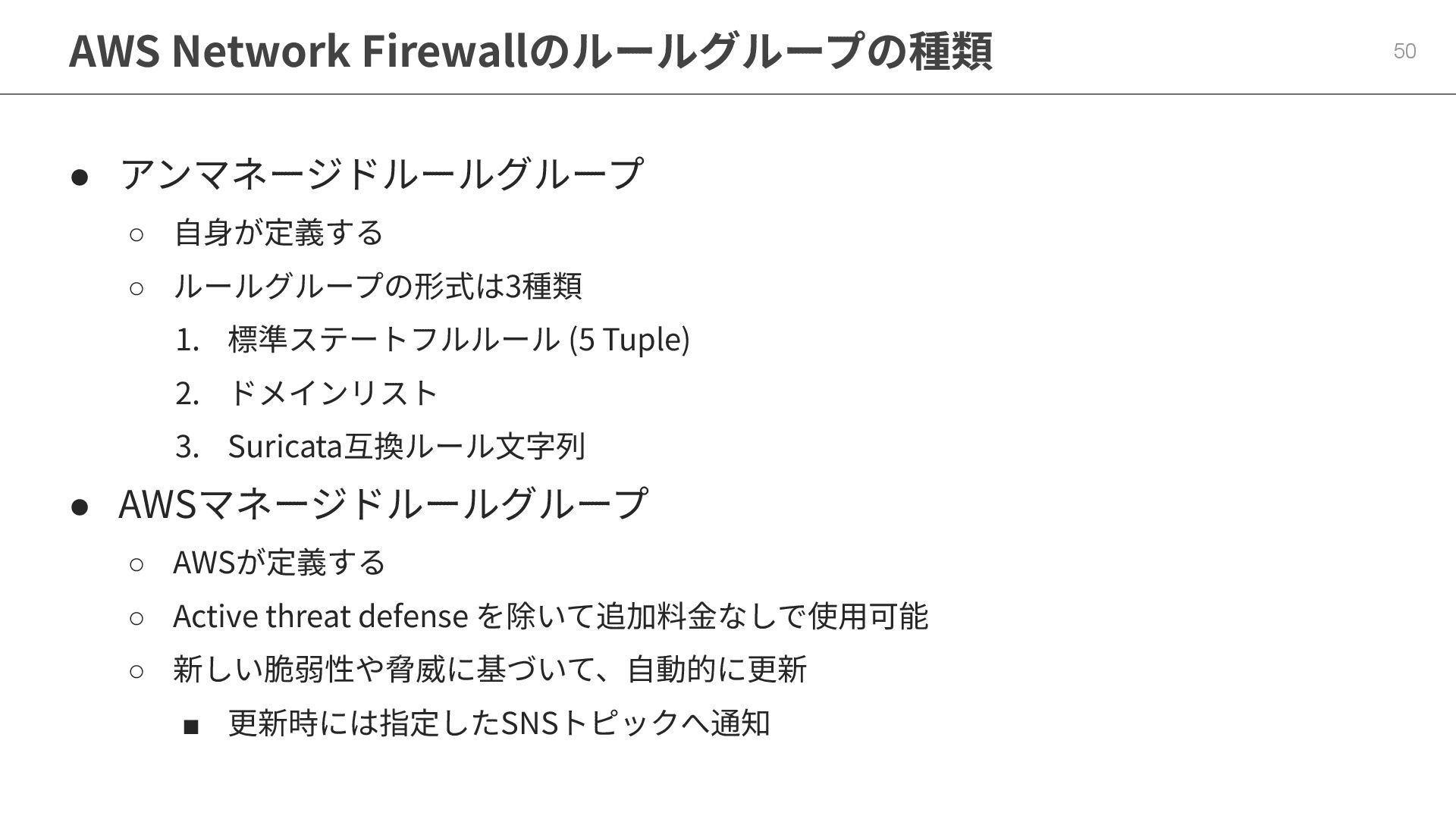 1. 標準ステートフルルール (5 Tuple) 2. ドメインリスト 3. Suricata互換ルール⽂字列 • AWSマネージドルールグループ ◦ AWSが定義する ◦ Active threat defense を除いて追加料⾦なしで使⽤可能 ◦ 新しい脆弱性や脅威に基づいて、⾃動的に更新 ▪ 更新時には指定したSNSトピックへ通知