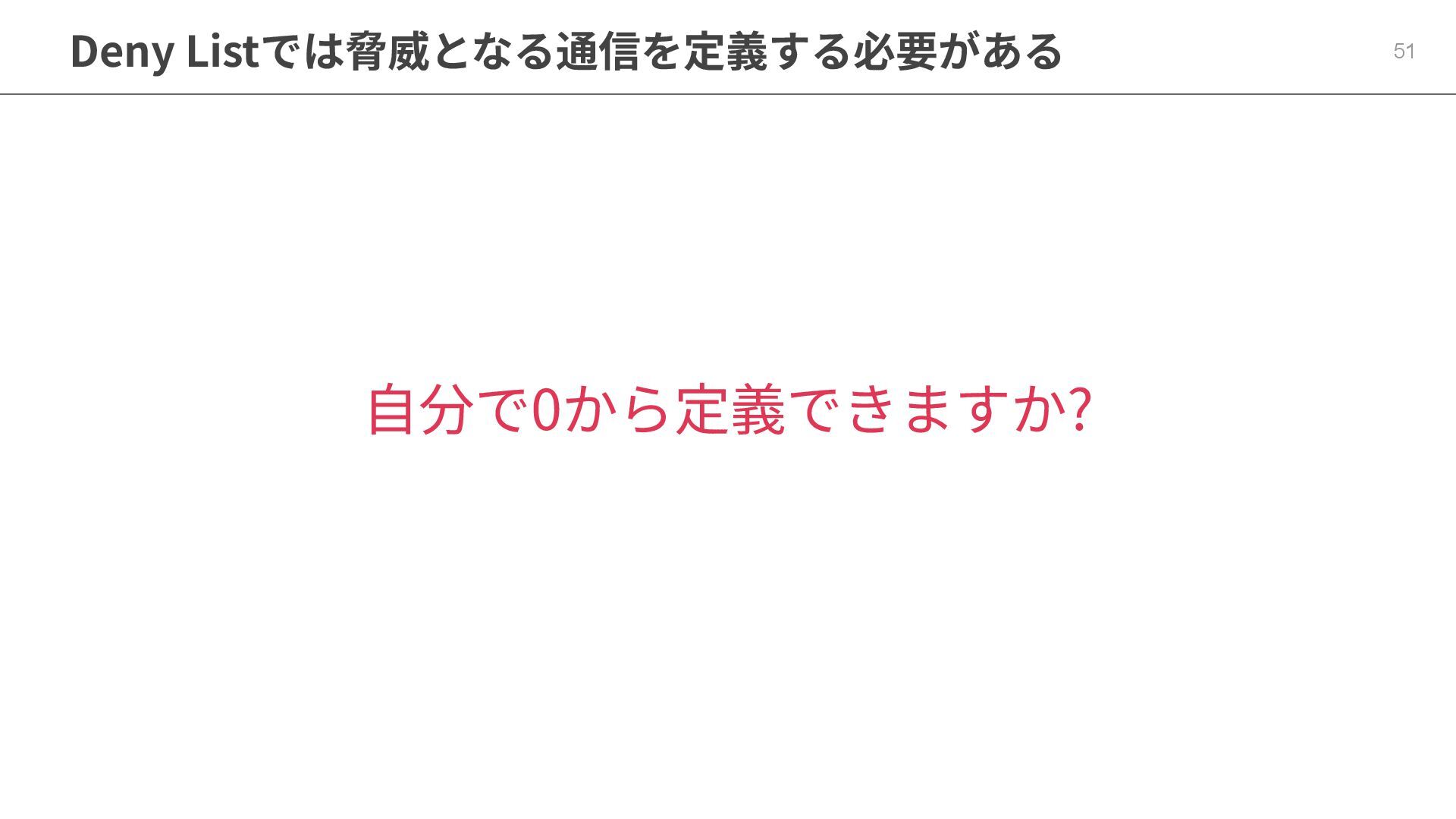 ⾃分で0から定義できますか? Deny Listでは脅威となる通信を定義する必要がある 51