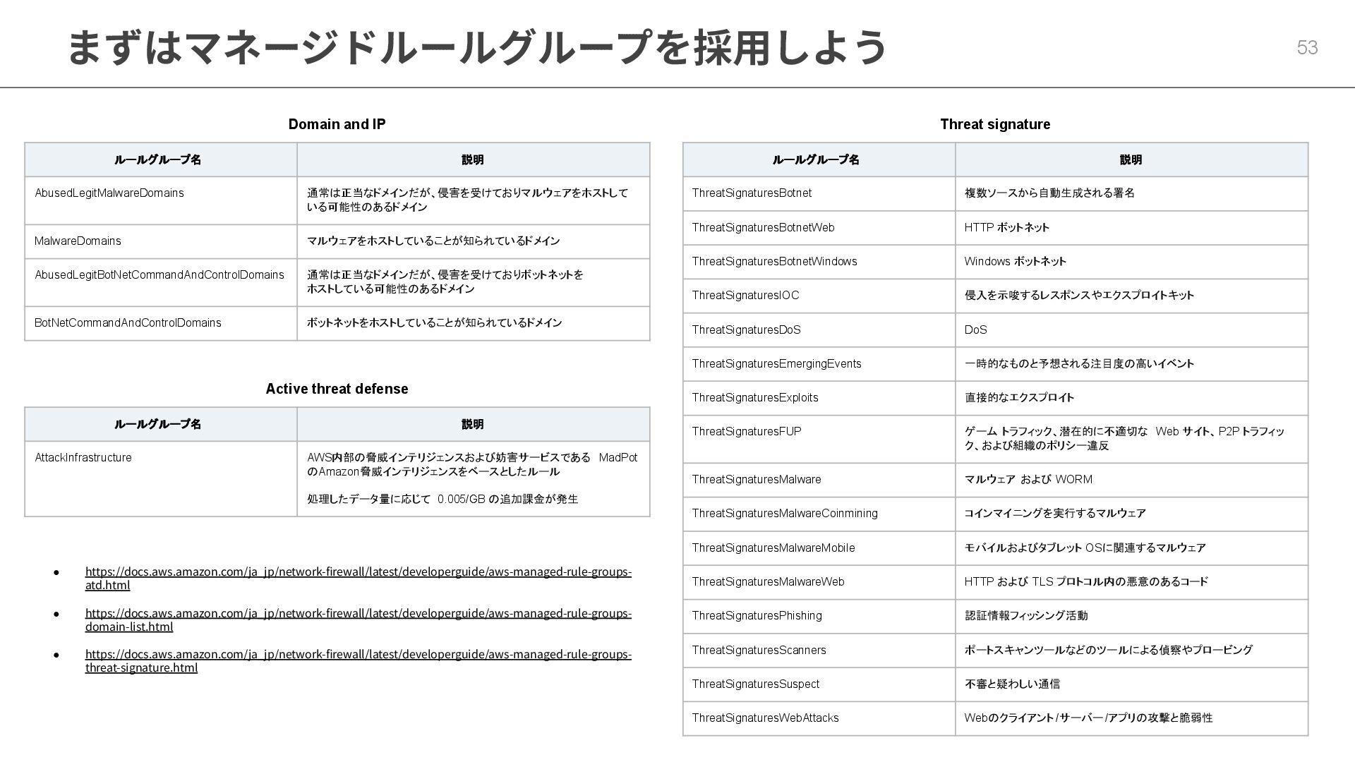 MalwareDomains マルウェアをホストしていることが知られているドメイン AbusedLegitBotNetCommandAndControlDomains 通常は正当なドメインだが、侵害を受けておりボットネットを ホストしている可能性のあるドメイン BotNetCommandAndControlDomains ボットネットをホストしていることが知られているドメイン Threat signature ルールグループ名 説明 ThreatSignaturesBotnet 複数ソースから自動生成される署名 ThreatSignaturesBotnetWeb HTTP ボットネット ThreatSignaturesBotnetWindows Windows ボットネット ThreatSignaturesIOC 侵入を示唆するレスポンスやエクスプロイトキット ThreatSignaturesDoS DoS ThreatSignaturesEmergingEvents 一時的なものと予想される注目度の高いイベント ThreatSignaturesExploits 直接的なエクスプロイト ThreatSignaturesFUP ゲーム トラフィック、潜在的に不適切な Web サイト、P2P トラフィッ ク、および組織のポリシー違反 ThreatSignaturesMalware マルウェア および WORM ThreatSignaturesMalwareCoinmining コインマイニングを実行するマルウェア ThreatSignaturesMalwareMobile モバイルおよびタブレット OSに関連するマルウェア ThreatSignaturesMalwareWeb HTTP および TLS プロトコル内の悪意のあるコード ThreatSignaturesPhishing 認証情報フィッシング活動 ThreatSignaturesScanners ポートスキャンツールなどのツールによる偵察やプロービング ThreatSignaturesSuspect 不審と疑わしい通信 ThreatSignaturesWebAttacks Webのクライアント /サーバー/アプリの攻撃と脆弱性 Active threat defense ルールグループ名 説明 AttackInfrastructure AWS内部の脅威インテリジェンスおよび妨害サービスである MadPot のAmazon脅威インテリジェンスをベースとしたルール 処理したデータ量に応じて 0.005/GB の追加課金が発生 • https://docs.aws.amazon.com/ja_jp/network-firewall/latest/developerguide/aws-managed-rule-groups- atd.html • https://docs.aws.amazon.com/ja_jp/network-firewall/latest/developerguide/aws-managed-rule-groups- domain-list.html • https://docs.aws.amazon.com/ja_jp/network-firewall/latest/developerguide/aws-managed-rule-groups- threat-signature.html