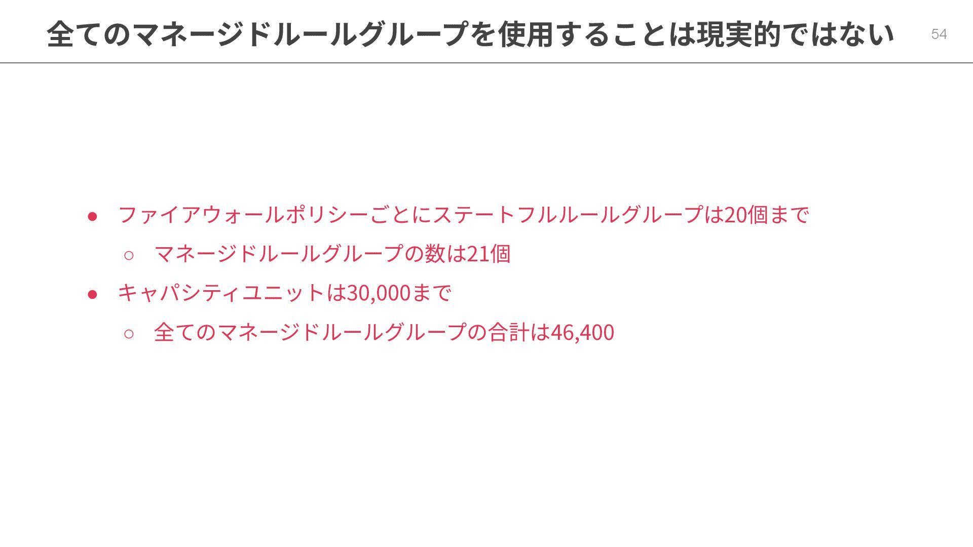 • ファイアウォールポリシーごとにステートフルルールグループは20個まで ◦ マネージドルールグループの数は21個 • キャパシティユニットは30,000まで ◦ 全てのマネージドルールグループの合計は46,400 全てのマネージドルールグループを使⽤することは現実的ではない 54