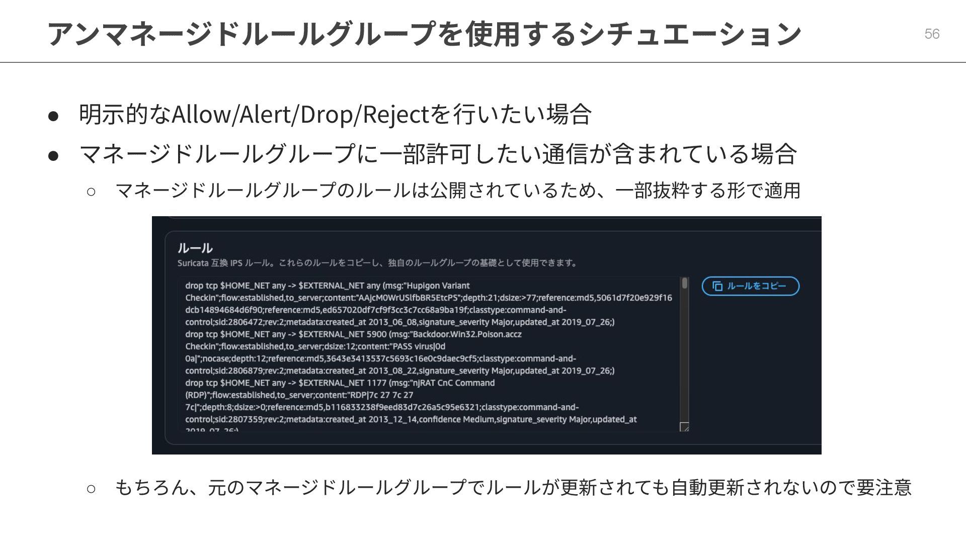 想定している脅威からルールグループを 厳選する必要がある そのため 55