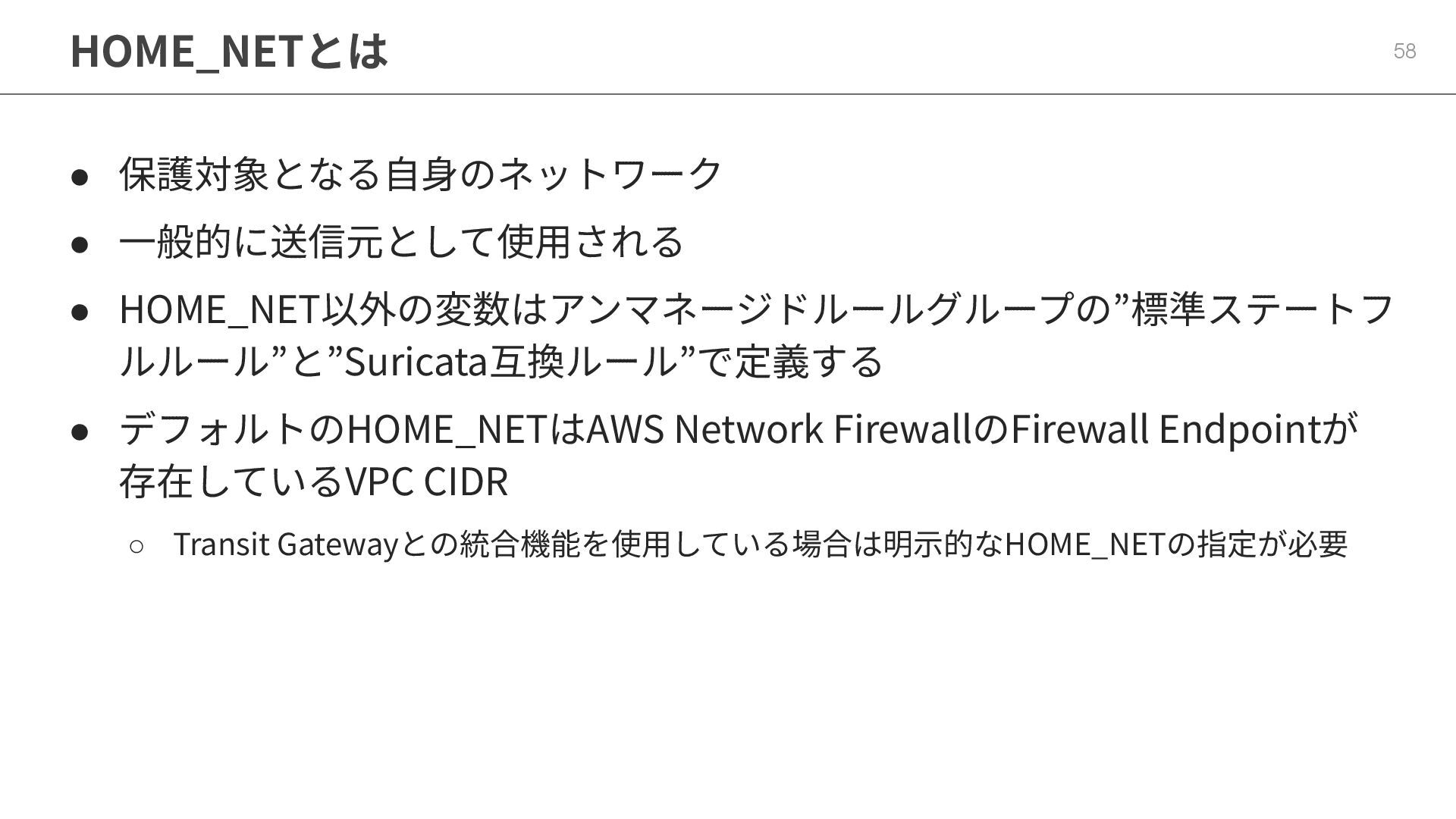 デフォルトのHOME_NETはAWS Network FirewallのFirewall Endpointが 存在しているVPC CIDR ◦ Transit Gatewayとの統合機能を使⽤している場合は明⽰的なHOME_NETの指定が必要