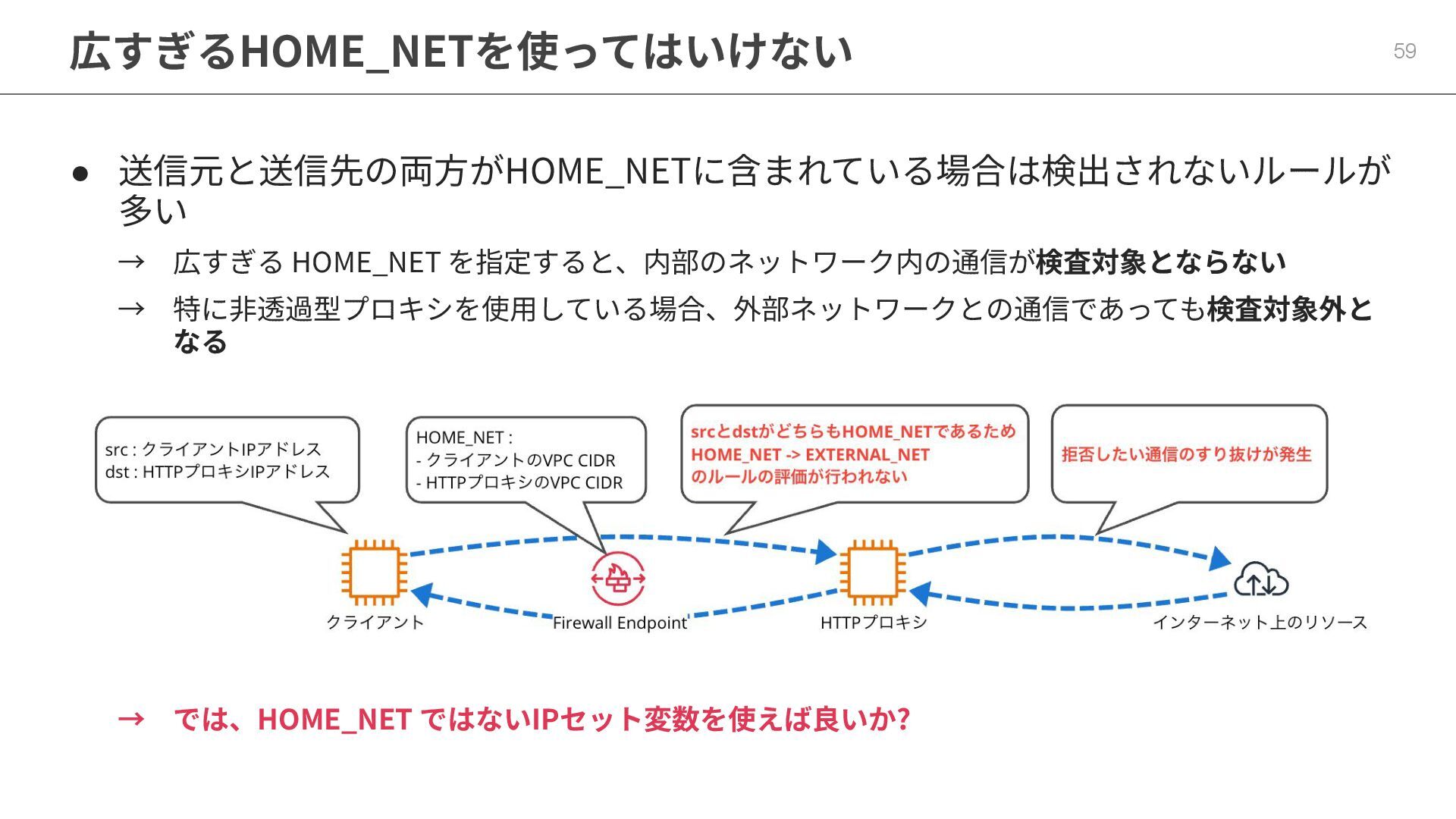 • 何はともあれ対称ルーティング • Allow List vs Deny List • 最初の第⼀歩、マネージドルール (時間があれば) • HOME_NET は適切なサイズで運⽤を (時間があれば)
