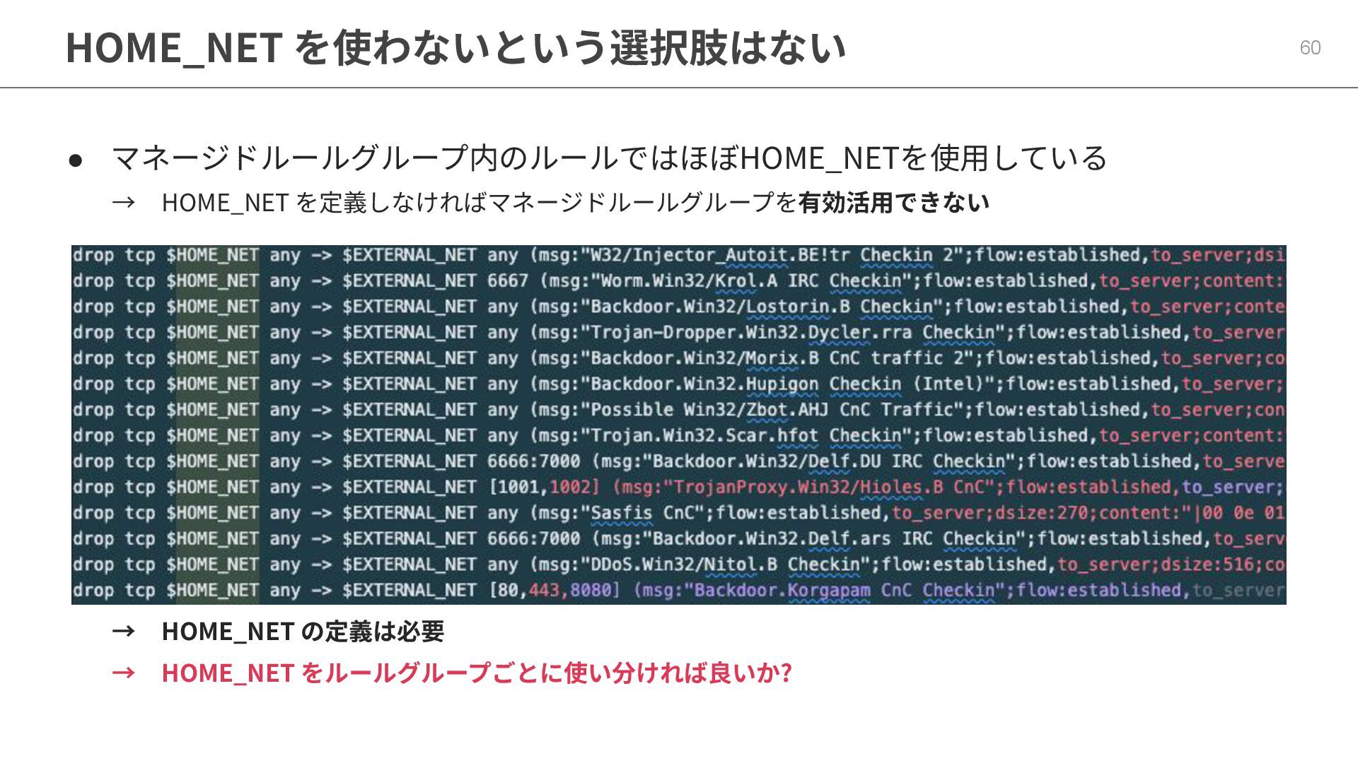 広すぎるHOME_NETを使ってはいけない 59 • 送信元と送信先の両⽅がHOME_NETに含まれている場合は検出されないルールが 多い → 広すぎる HOME_NET を指定すると、内部のネットワーク内の通信が検査対象とならない →