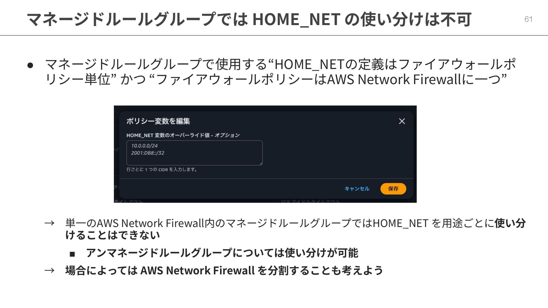 Firewallに⼀つ” → 単⼀のAWS Network Firewall内のマネージドルールグループではHOME_NET を⽤途ごとに使い分 けることはできない ▪ アンマネージドルールグループについては使い分けが可能 → 場合によっては AWS Network Firewall を分割することも考えよう