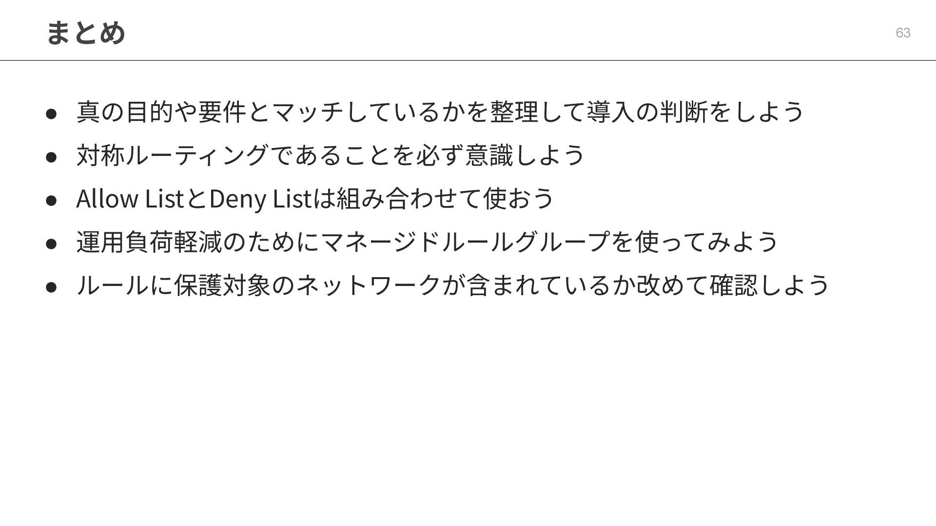 まとめ 63 • 真の⽬的や要件とマッチしているかを整理して導⼊の判断をしよう • 対称ルーティングであることを必ず意識しよう • Allow ListとDeny Listは組み合わせて使おう