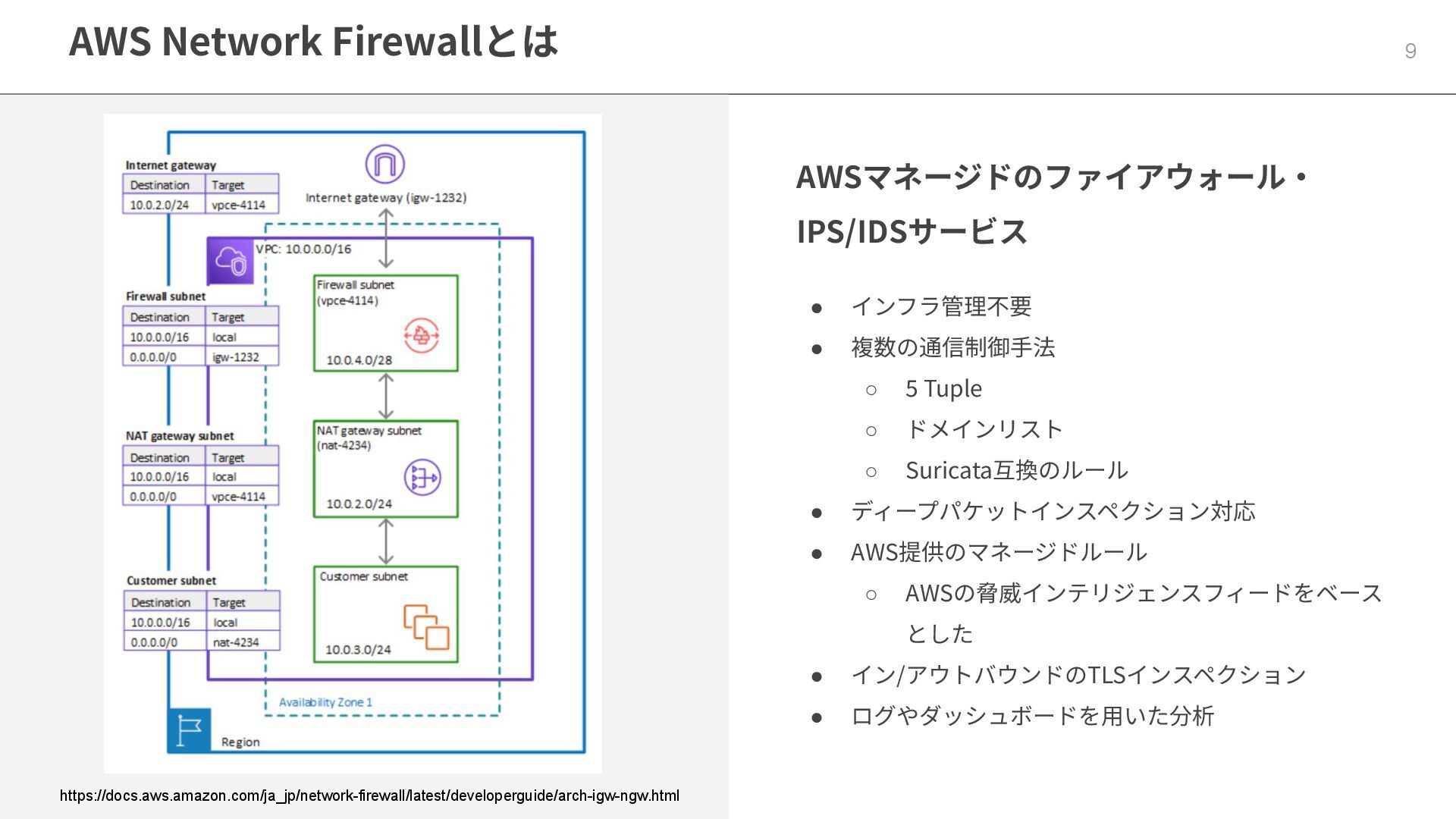 ◦ 5 Tuple ◦ ドメインリスト ◦ Suricata互換のルール • ディープパケットインスペクション対応 • AWS提供のマネージドルール ◦ AWSの脅威インテリジェンスフィードをベース とした • イン/アウトバウンドのTLSインスペクション • ログやダッシュボードを⽤いた分析 https://docs.aws.amazon.com/ja_jp/network-firewall/latest/developerguide/arch-igw-ngw.html