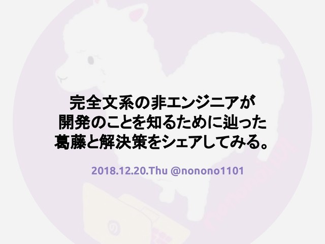 完全文系 非エンジニアが 開発 ことを知るために辿った 葛藤と解決策をシェアしてみる。 2018.12.20.Thu @nonono1101