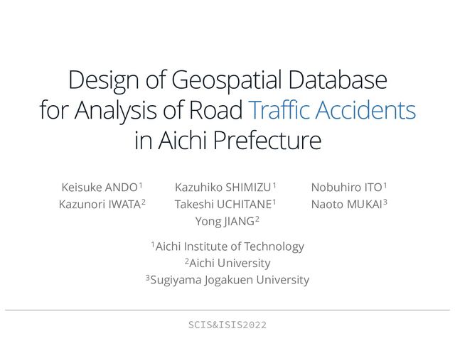 study 5 statistical models1,2 road geometry3,4 spatiotemporal data5 Focusing on A new analysis requires collecting the necessary data building a database from scratch 1Watanabe and Nakamura (2015) 2Hyodo et al. (2017) 3Shiomi et al. (2016) 4Mukai et al. (2020) 5Kato et al. (2020)