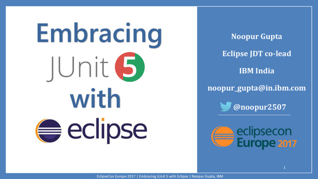 JUnit Test Case wizard offers to add it while creating a new JUnit Jupiter test. Quick Fix (Ctrl+1) proposal on @Test. Add library (JUnit) in Java Build Path dialog. EclipseCon Europe 2017 | Embracing JUnit 5 with Eclipse | Noopur Gupta, IBM