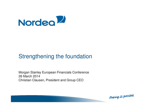 views with respect to certain future events and potential financial performance. Although Nordea believes that the expectations reflected in such forward-looking statements are reasonable, no assurance can be given that such expectations will prove to have been correct. Accordingly, results could differ materially from those set out in the forward-looking statements as a result of various factors. Important factors that may cause such a difference for Nordea include, but are not limited to: (i) the macroeconomic development, (ii) change in the competitive climate, (iii) change in the regulatory environment and other government actions and (iv) change in interest rate and foreign exchange rate levels. This presentation does not imply that Nordea has undertaken to revise these forward-looking statements, beyond what is required by applicable law or applicable stock exchange regulations if and when circumstances arise that will lead to changes compared to the date when these statements were provided.