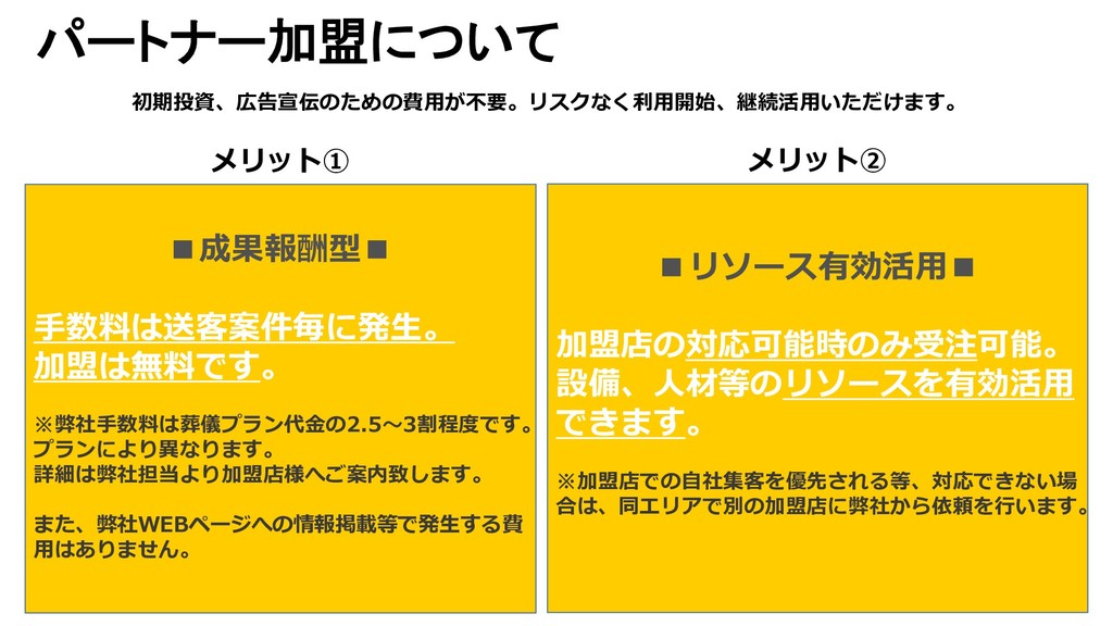 パートナー加盟について 初期投資、広告宣伝のための費用が不要。リスクなく利用開始、継続活用いただけます。 メリット① メリット② ▪成果報酬型▪ 手数料は送客案件毎に発生。 加盟は無料です。 ※弊社手数料は葬儀プラン代金の2.5~3割程度です。 プランにより異なります。 詳細は弊社担当より加盟店様へご案内致します。