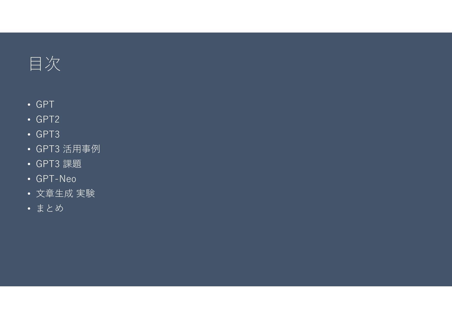 • GPT3 課題 • GPT-Neo • 文章生成 実験 • まとめ