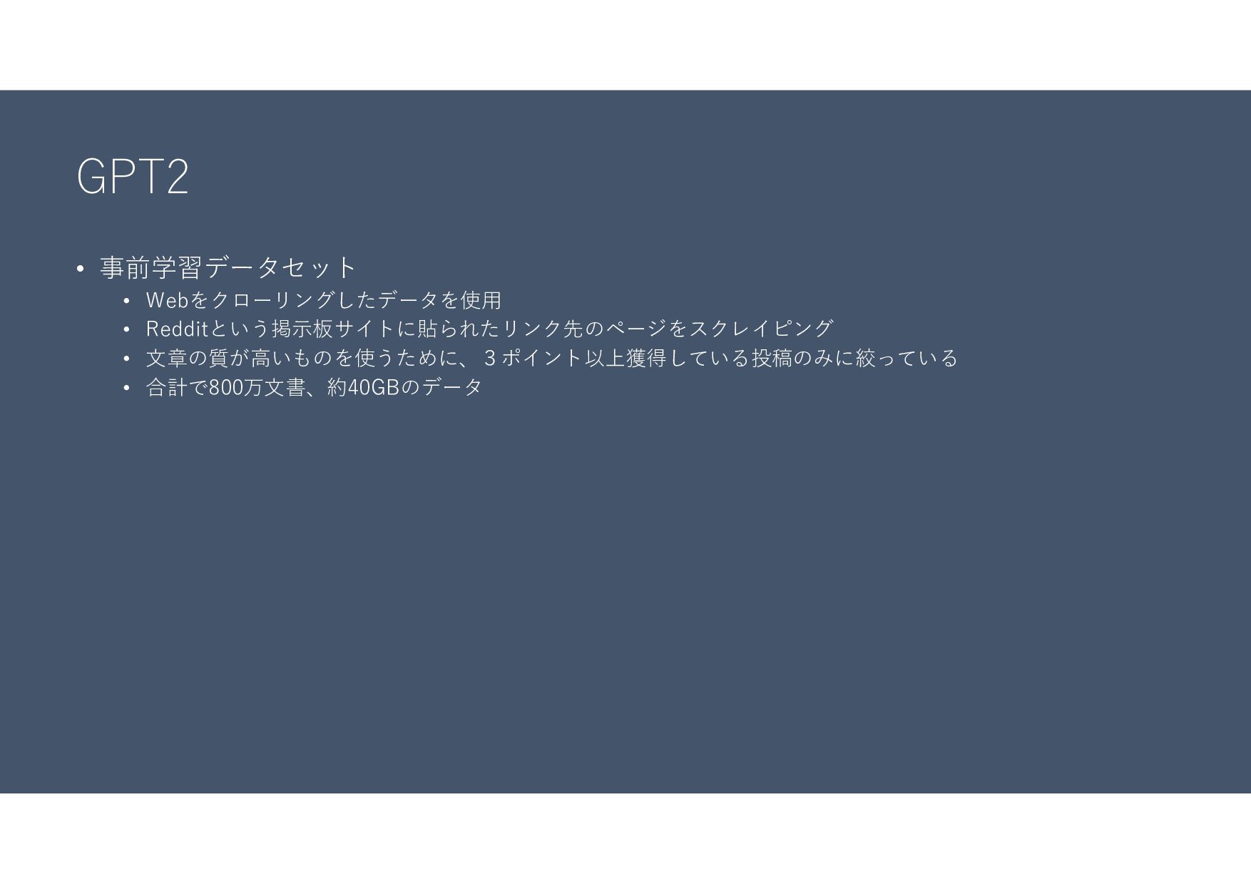 GPT2 • 事前学習データセット • Webをクローリングしたデータを使用 • Redditという掲示板サイトに貼られたリンク先のページをスクレイピング • 文章の質が高いものを使うために、3ポイント以上獲得している投稿のみに絞っている •