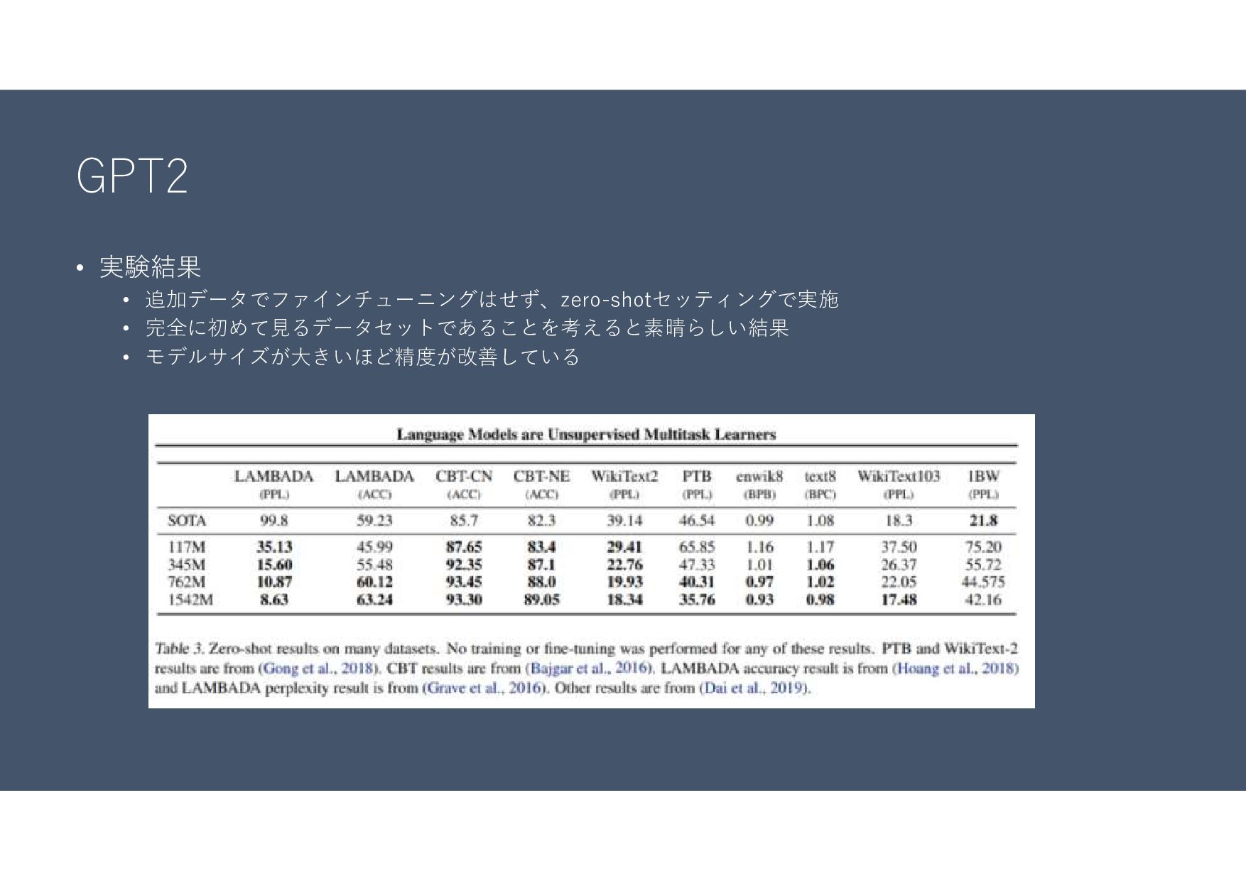 GPT2 • 実験結果 • 追加データでファインチューニングはせず、zero-shotセッティングで実施 • 完全に初めて見るデータセットであることを考えると素晴らしい結果 • モデルサイズが大きいほど精度が改善している