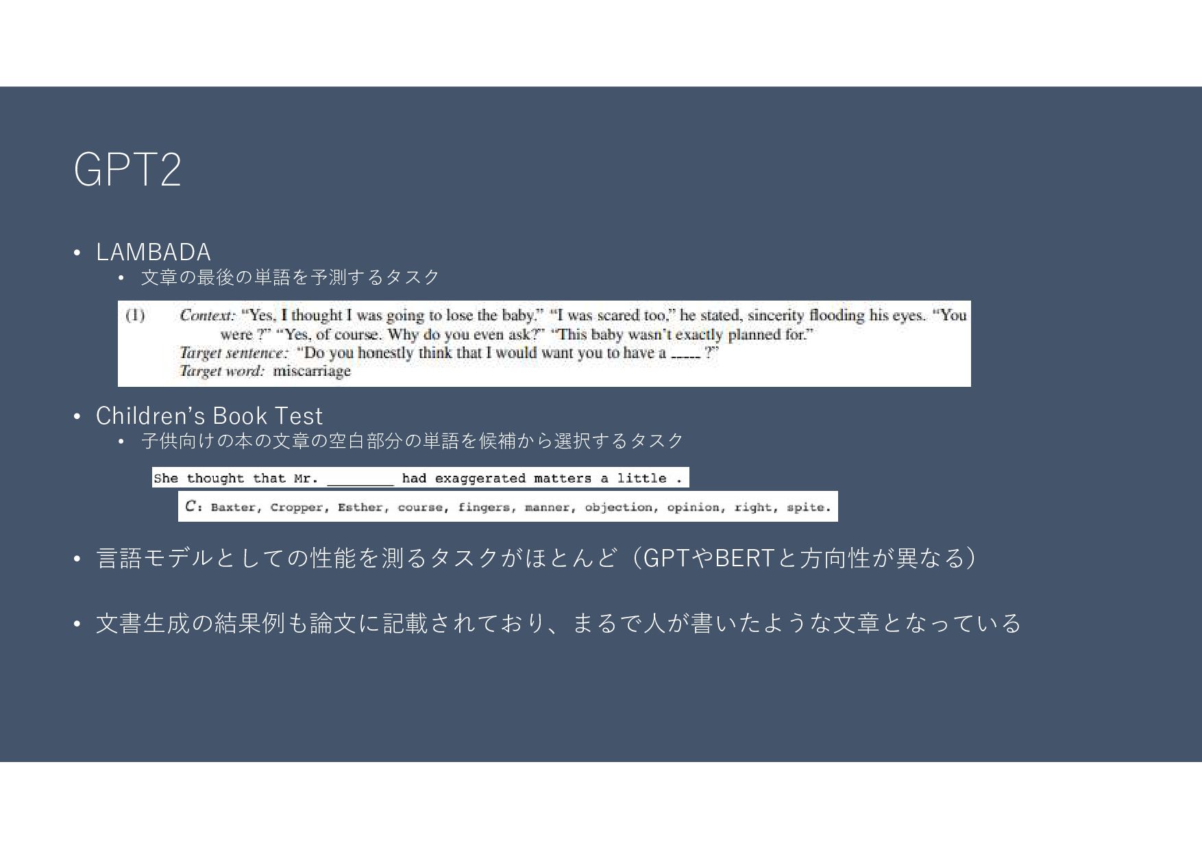 子供向けの本の文章の空白部分の単語を候補から選択するタスク • 言語モデルとしての性能を測るタスクがほとんど(GPTやBERTと方向性が異なる) • 文書生成の結果例も論文に記載されており、まるで人が書いたような文章となっている