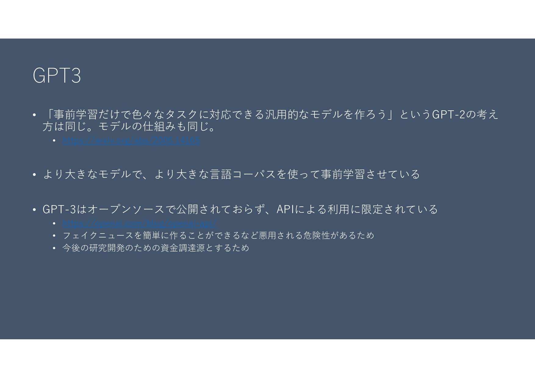 GPT3 • 「事前学習だけで色々なタスクに対応できる汎用的なモデルを作ろう」というGPT-2の考え 方は同じ。モデルの仕組みも同じ。 • https://arxiv.org/abs/2005.14165 • より大きなモデルで、より大きな言語コーパスを使って事前学習させている • GPT-3はオープンソースで公開されておらず、APIによる利用に限定されている