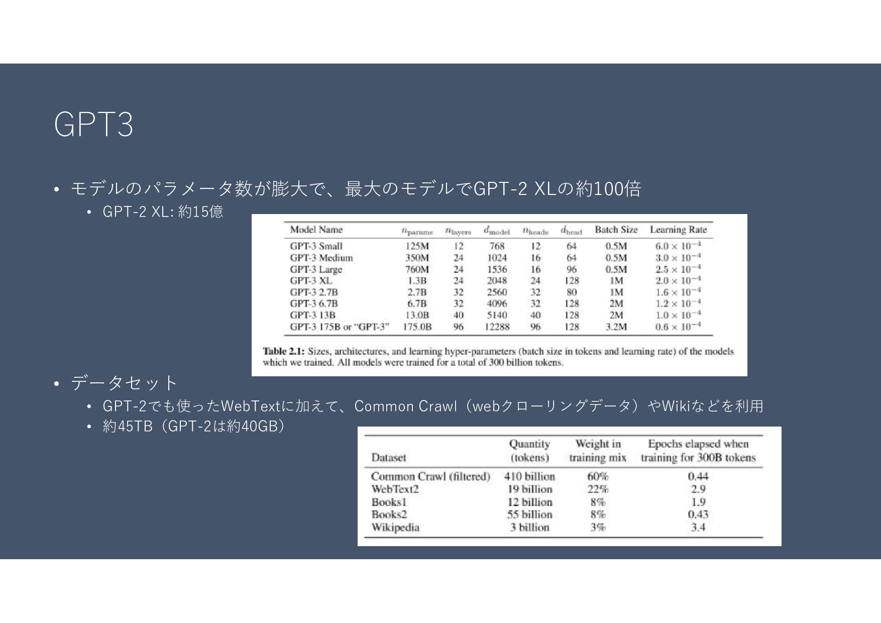 • GPT-2でも使ったWebTextに加えて、Common Crawl(webクローリングデータ)やWikiなどを利用 • 約45TB(GPT-2は約40GB)