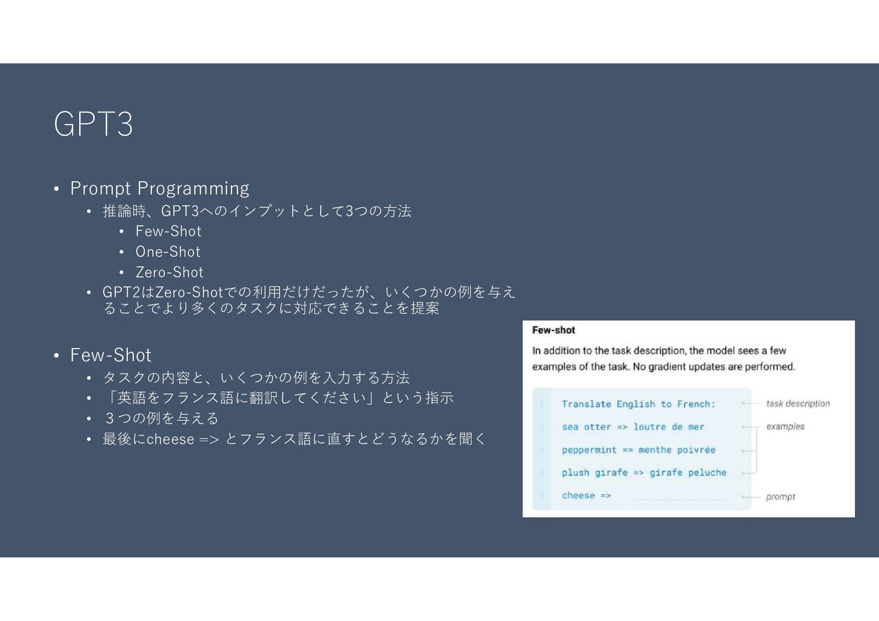 • Zero-Shot • GPT2はZero-Shotでの利用だけだったが、いくつかの例を与え ることでより多くのタスクに対応できることを提案 • Few-Shot • タスクの内容と、いくつかの例を入力する方法 • 「英語をフランス語に翻訳してください」という指示 • 3つの例を与える • 最後にcheese => とフランス語に直すとどうなるかを聞く