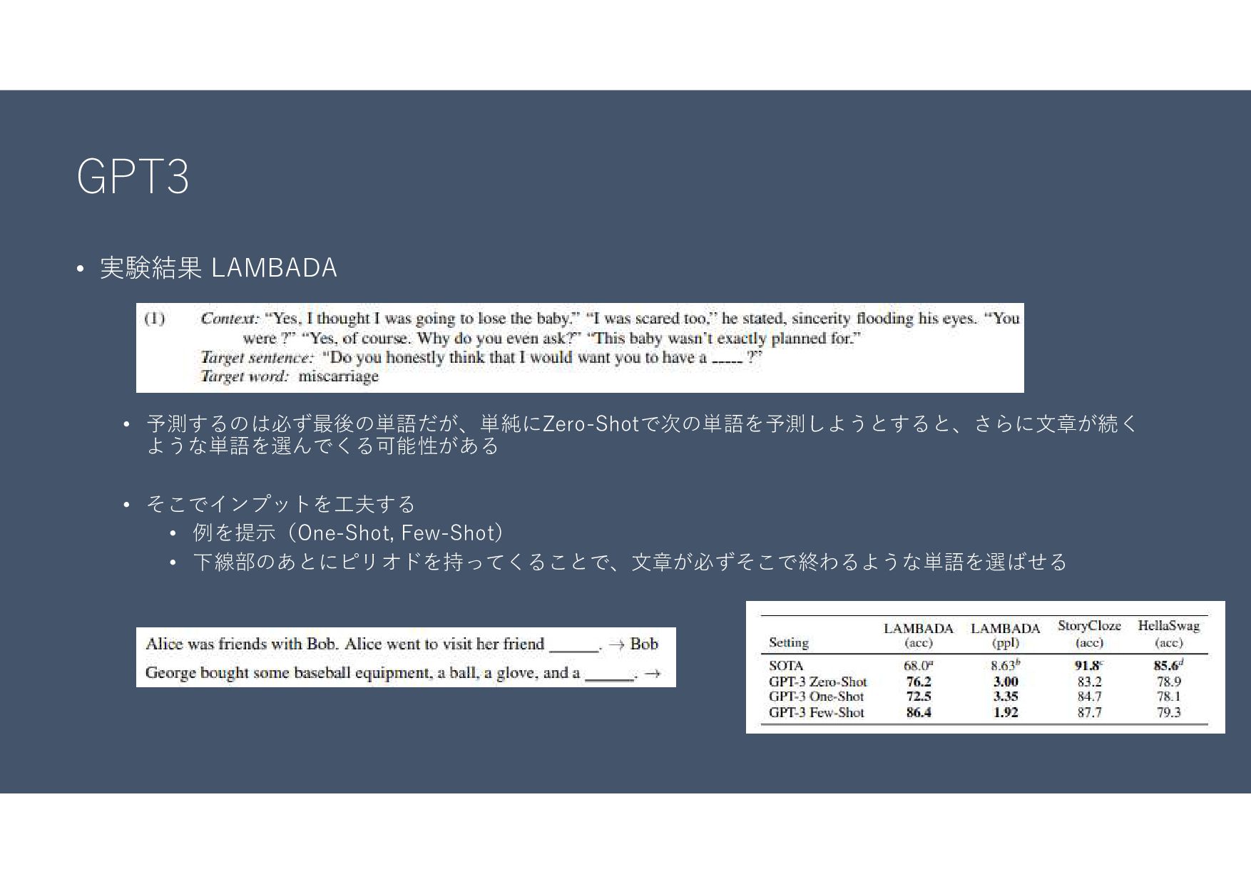 GPT3 • 実験結果 LAMBADA • 予測するのは必ず最後の単語だが、単純にZero-Shotで次の単語を予測しようとすると、さらに文章が続く ような単語を選んでくる可能性がある • そこでインプットを工夫する •