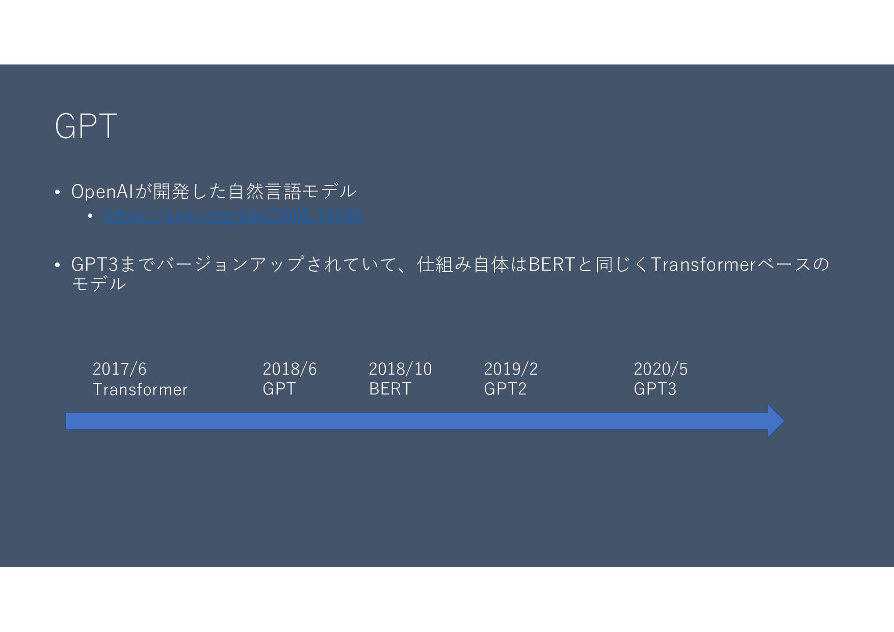 GPT • OpenAIが開発した自然言語モデル • https://arxiv.org/abs/2005.14165 • GPT3までバージョンアップされていて、仕組み自体はBERTと同じくTransformerベースの モデル 2017/6 Transformer