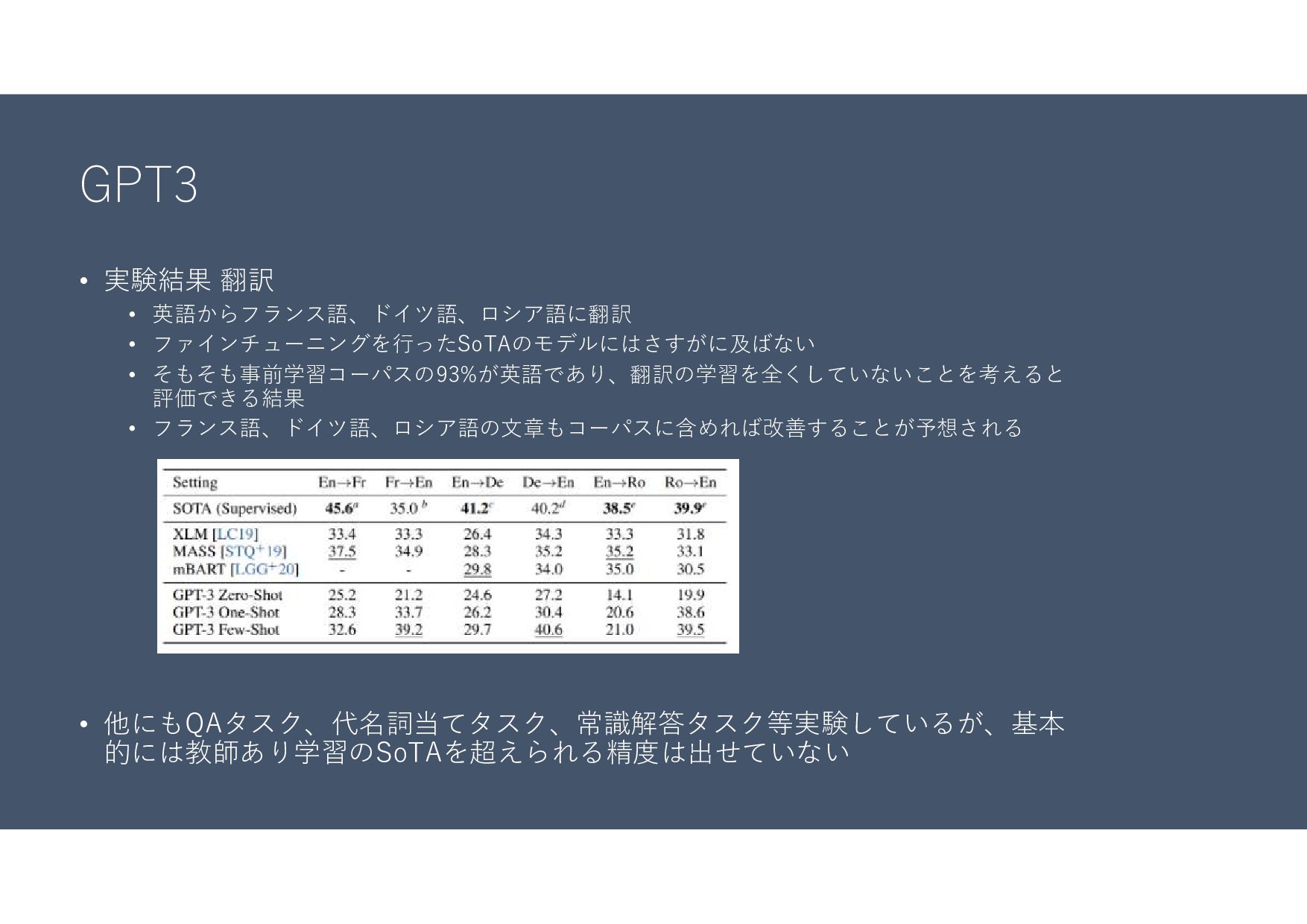 GPT3 • 実験結果 翻訳 • 英語からフランス語、ドイツ語、ロシア語に翻訳 • ファインチューニングを行ったSoTAのモデルにはさすがに及ばない • そもそも事前学習コーパスの93%が英語であり、翻訳の学習を全くしていないことを考えると