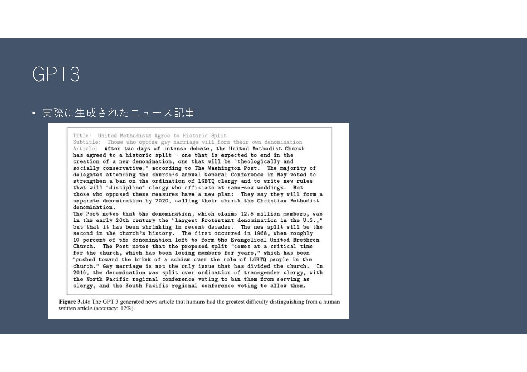 GPT3 • 文書生成タスク • 非常に話題になったニュース記事の生成タスク • ニュースのタイトルとサブタイトルをGPT3に入力して、ニュースを生成させる • 80人にそれが本当のニュースか、GPT3が生成した偽のニュースかを判定してもらう •