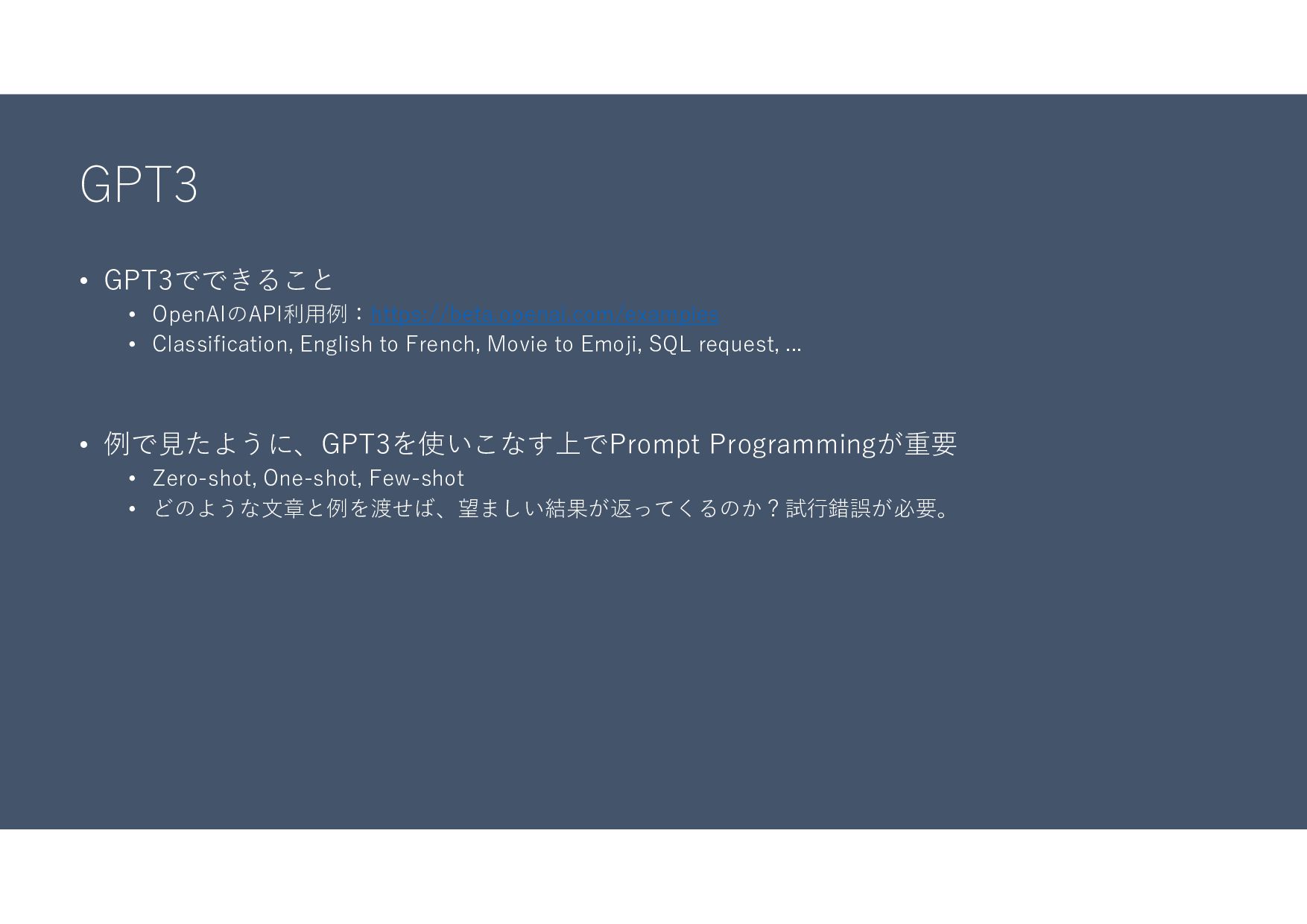 GPT3 • GPT3でできること • OpenAIのAPI利用例:https://beta.openai.com/examples • Classification, English to French,