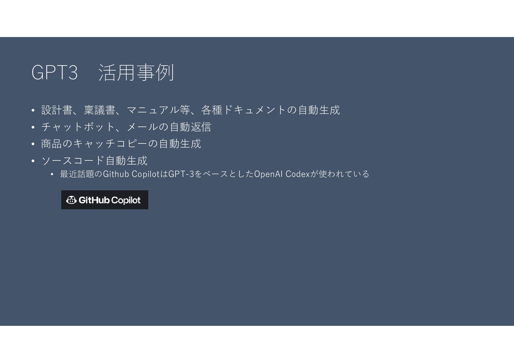 • 最近話題のGithub CopilotはGPT-3をベースとしたOpenAI Codexが使われている