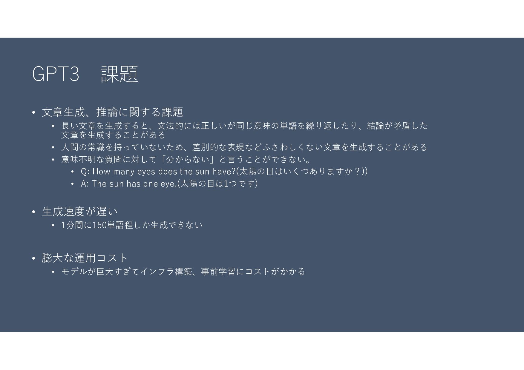 意味不明な質問に対して「分からない」と言うことができない。 • Q: How many eyes does the sun have?(太陽の目はいくつありますか?)) • A: The sun has one eye.(太陽の目は1つです) • 生成速度が遅い • 1分間に150単語程しか生成できない • 膨大な運用コスト • モデルが巨大すぎてインフラ構築、事前学習にコストがかかる