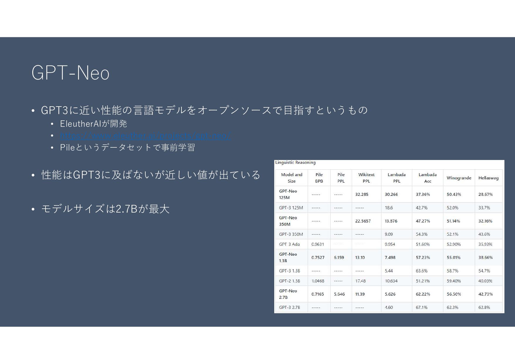 GPT-Neo • GPT3に近い性能の言語モデルをオープンソースで目指すというもの • EleutherAIが開発 • https://www.eleuther.ai/projects/gpt-neo/ • Pileというデータセットで事前学習 •
